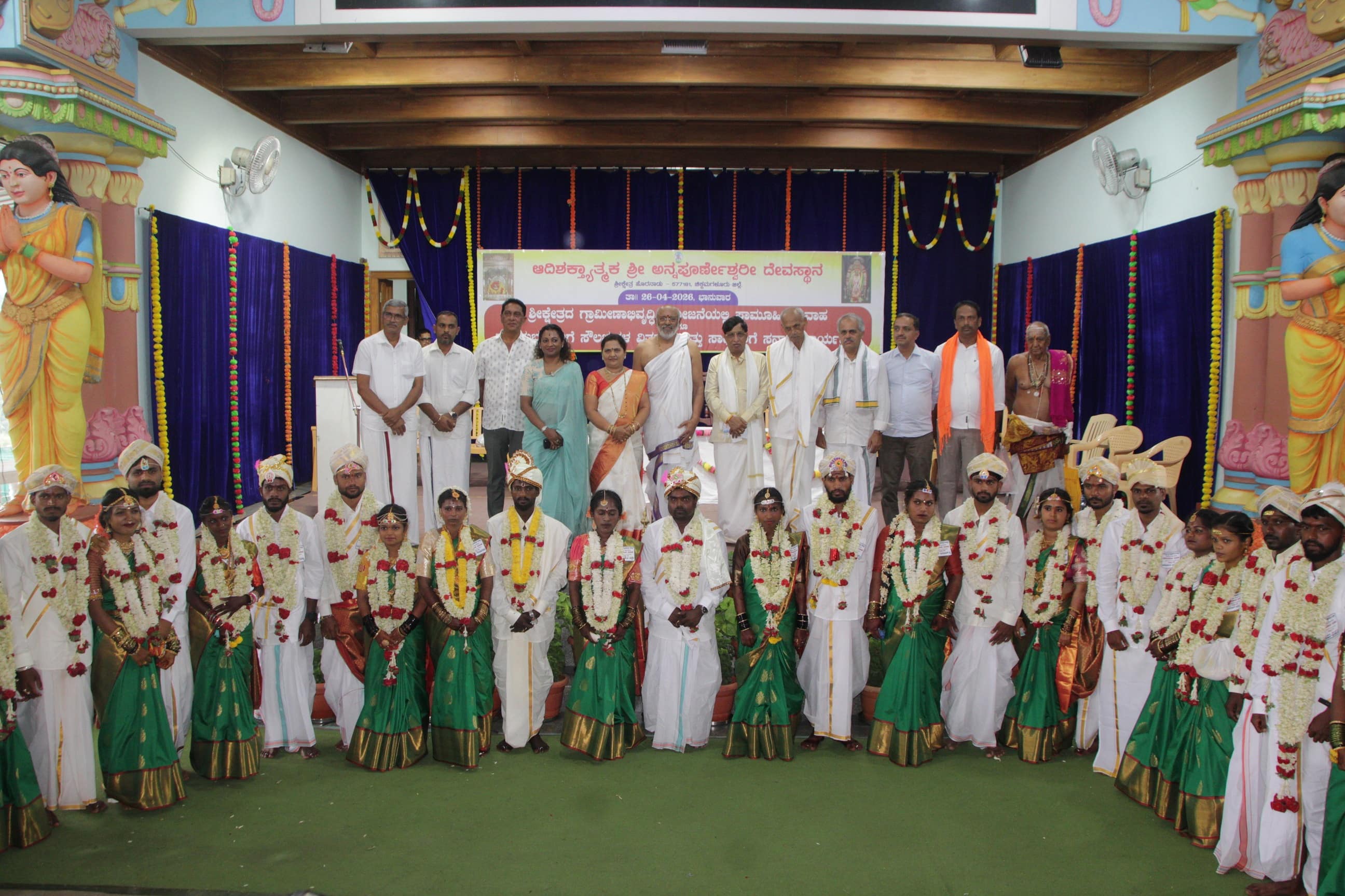 ಹೊರನಾಡು ಆದಿಶಕ್ತ್ಯಾತ್ಮಕ ಅನ್ನಪೂರ್ಣೇಶ್ವರಿ ದೇವಾಲಯದ ಲಲಿತಕಲಾ ಮಂಟಪದಲ್ಲಿ ಶ್ರೀ ಕ್ಷೇತ್ರದ ಗ್ರಾಮೀಣಾಭಿವೃದ್ಧಿ ಯೋಜನೆಯ ಸಪ್ತಪದಿ ಯೋಜನೆಯಡಿ ಹಮ್ಮಿಕೊಳ್ಳಲಾಗಿದ್ದ ಸಾಮೂಹಿಕ ವಿವಾಹದಲ್ಲಿ 14 ಜೋಡಿ ಸಪ್ತಪದಿ ತುಳಿದರು.