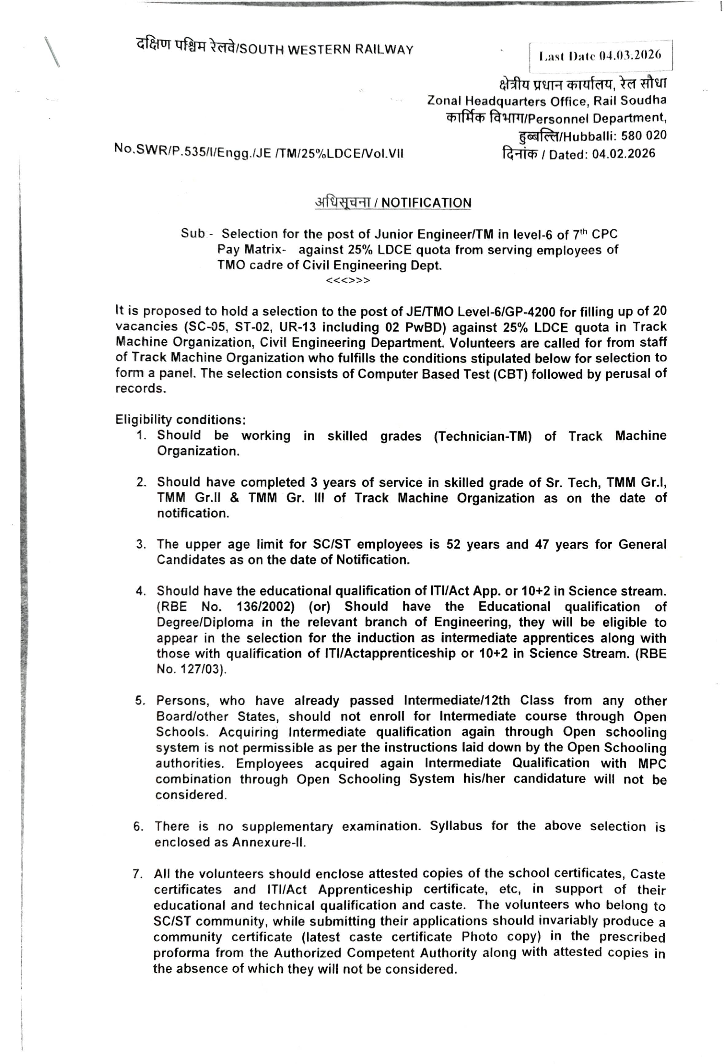 5. ಜೂನಿಯರ್ ಎಂಜಿನಿಯರ್/ಟ್ರ್ಯಾಕ್ ಮೇಂಟೆನನ್ಸ್ ಹುದ್ದೆಗೆ 2026ರ ಫೆ.4ರಂದು ಅಧಿಸೂಚನೆ ಪ್ರಕಟ. ಅದರಲ್ಲೂ ಕನ್ನಡ ಇಲ್ಲ