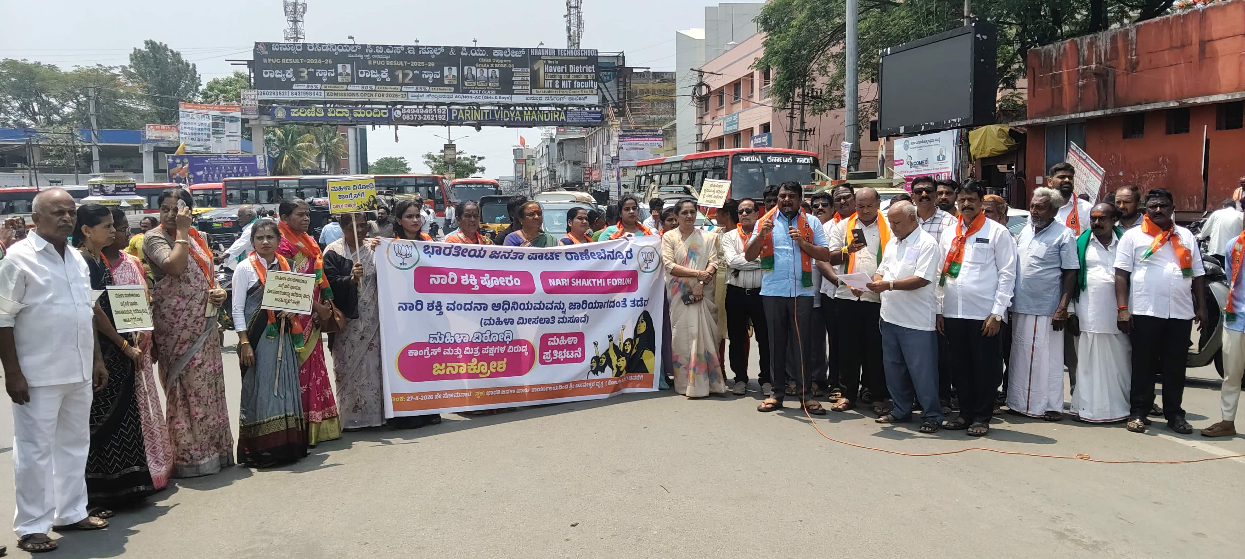ರಾಣಿಬೆನ್ನೂರು: ಸಂಸತ್ತಿನಲ್ಲಿ ಶೇ. 33ರಷ್ಟು ಮಹಿಳಾ ಮೀಸಲಾತಿ ಅಂಗೀಕಾರಕ್ಕೆ ಅಡ್ಡಿಪಡಿಸಿದ ಕಾಂಗ್ರೆಸ್ ನಡೆ ಖಂಡಿಸಿ ಬಿಜೆಪಿ ಮಹಿಳಾ ಕಾರ್ಯಕರ್ತರು ಸೋಮವಾರ ನಗರದ ಬಸವೇಶ್ವರ ವೃತ್ತದ (ಕೋರ್ಟ್ ಸರ್ಕಲ್) ಬಳಿ ಪ್ರತಿಭಟನೆ ನಡೆಸಿದರು. ನಗರದ ಸ್ಟೇಷನ್ ರಸ್ತೆ ಬಿಜೆಪಿ ಕಚೇರಿ ಬಳಿಯಿಂದ ಪಾದಯಾತ್ರೆ ಮೂಲಕ ಕೋರ್ಟ್ ಸರ್ಕಲ್ವರೆಗೆ ಸಾಗಿ ಬಂದರು. ದಾರಿಯುದ್ದಕ್ಕೂ ಕಾಂಗ್ರೆಸ್ ನಡೆ ಖಂಡಿಸಿ ಪ್ರತಿಭಟನಾಕಾರರು ಘೋಷಣೆಗಳನ್ನು ಕೂಗಿದರು. ಮಾಜಿ ಶಾಸಕ ಅರುಣಕುಮಾರ ಪೂಜಾರ ಮಾತನಾಡಿ, ಮಹಿಳೆಯರು ಶಾಸನ ಸಭೆಗಳಲ್ಲಿ ಶೇ.33 ಮೀಸಲಾತಿ ಕಲ್ಪಿಸುವ ಉದ್ದೇಶದಿಂದ ಪ್ರಧಾನಮಂತ್ರಿ ನರೇಂದ್ರ ಮೋದಿ ನೇತೃತ್ವದ ಕೇಂದ್ರ ಸರ್ಕಾರ ಲೋಕಸಭೆಯಲ್ಲಿ ಮಸೂದೆ ಮಂಡಿಸಿತ್ತು. ಸರ್ವಾನುಮತದಿಂದ ಮಸೂದೆಗೆ ಸಮ್ಮತಿ ಸೂಚಿಸುವ ಬದಲು ಕಾಂಗ್ರೆಸ್ ನೇತೃತ್ವದ ವಿಪಕ್ಷಗಳು ಅದು ಅಂಗೀಕಾರವಾಗದಂತೆ ನೋಡಿಕೊಂಡರು. ರಾಹುಲ್ ಗಾಂಧಿಯವರ ಅಜ್ಜಿ ಕೂಡ ಒಬ್ಬ ಮಹಿಳೆಯಾಗಿದ್ದು ದೇಶದ ಪ್ರಧಾನಿಯಾಗಿ ಸೇವೆ ಸಲ್ಲಿಸಿದ್ದಾರೆ. ಇದಲ್ಲದೆ ಅವರ ತಾಯಿ ಕೂಡ ಈ ಹಿಂದೆ ಲೋಕಸಭೆ ಸದಸ್ಯೆಯಾಗಿದ್ದು ಇದೀಗ ರಾಜ್ಯಸಭೆ ಸದಸ್ಯರಾಗಿ ಕಾರ್ಯನಿರ್ವಹಿಸುತ್ತಿದ್ದಾರೆ. ಅವರ ಸಹೋದರಿ ಕೂಡ ಸಂಸದೆಯಾಗಿದ್ದಾರೆ. ಇದನ್ನು ಗಮನಿಸಿದಾಗ ತಮ್ಮ ಕುಟುಂಬದ ಮಹಿಳೆಯರು ಮಾತ್ರ ಶಾಸನ ಸಭೆಗಳ ಸದಸ್ಯರಾಗಬಹುದು. ಆದರೆ ದೇಶದ ಬೇರೆ ಮಹಿಳೆಯರಿಗೆ ಇಂತಹ ಅವಕಾಶ ಲಭಿಸಬಾರದು ಎಂಬ ಧೋರಣೆ ಹೊಂದಿದ್ದಾರೆ. ಮುಂದಿನ ದಿನಗಳಲ್ಲಿ ಪುನಃ ಸಂಸತ್ತಿನಲ್ಲಿ ಮಸೂದೆ ಅಂಗೀಕಾರಕ್ಕೆ ಬಿಜೆಪಿ ನೇತೃತ್ವದ ಎನ್ಡಿಎ ಶ್ರಮಿಸಲಿದೆ ಎಂದರು. ಕಾರವಾರ ಜಿಲ್ಲಾ ಉಸ್ತುವಾರಿ ಭಾರತಿ ಜಂಬಗಿ ಮಾತನಾಡಿ, ಮಹಿಳಾ ಮೀಸಲಾತಿ ಲಾಭ ಕೇವಲ ಬಿಜೆಪಿ ಮಹಿಳೆಯರಿಗೆ ಸಿಗುವುದಿಲ್ಲ. ಎಲ್ಲಾ ರಾಜಕೀಯ ಪಕ್ಷಗಳ ಮಹಿಳೆಯರಿಗೂ ಇದು ಪ್ರಯೋಜನಕಾರಿಯಾಗಿದೆ. ಆದ್ದರಿಂದ ನಮ್ಮ ಹೋರಾಟಕ್ಕೆ ಕಾಂಗ್ರೆಸ್ ಪಕ್ಷದ ಮಹಿಳೆಯರೂ ಕೈ ಜೋಡಿಸಬೇಕು ಎಂದರು. ರಾಜ್ಯ ಬಿಜೆಪಿ ಘಟಕದ ಉಪಾಧ್ಯಕ್ಷ ಡಾ. ಬಸವರಾಜ ಕೇಲಗಾರ, ನಗರ ಘಟಕದ ಅಧ್ಯಕ್ಷ ಮಂಜುನಾಥ ಕಾಟಿ, ಗ್ರಾಮೀಣ ಘಟಕದ ಅಧ್ಯಕ್ಷ ಸುಭಾಸ ಶಿರಗೇರಿ, ಚೋಳಪ್ಪ ಕಸವಾಳ, ಎ.ಬಿ. ಪಾಟೀಲ, ಅನ್ನಪೂರ್ಣ ಕಿಚಡಿ, ಗಂಗಮ್ಮ ಹಾವನೂರ, ಶಾರದಾ ಇಚ್ಚಂಗಿ, ಅಕ್ಷತಾ ಮಾಳಗಿಮನಿ, ಸುಮಲತಾ ಮಳ್ಳೂರ, ಭಾಗ್ಯ ಬೆನ್ನೂರ, ಮಮತಾ ಕಟ್ಟಪ್ಪನವರ, ಸರೋಜಾ ಕೊಟ್ರಪ್ಪನವರ, ಗಿರಿಜಮ್ಮ ನಿಡಗುಂದಿ, ಗೌರಮ್ಮ, ಲಿಂಗರಾಜ ಬೂದನೂರ, ರಾಜು ಬಣಕಾರ, ಮೌನೇಶ ತಳವಾರ, ಪವನಕುಮಾರ ಮಲ್ಲಾಡದ, ಸಿದ್ಧು ಚಿಕ್ಕಬಿದರಿ, ಅಶೋಕ ಪಾಸಿಗಾರ, ನವೀನ ಅಡ್ಡಿ, ರಮೇಶ ಕರಡೆಣ್ಣನವರ, ಶಿವಕುಮಾರ ಹರ್ಕನಾಳ, ಮೈಲಪ್ಪ ಗೋಣಿಬಸಮ್ಮನವರ, ಪ್ರಭುಸ್ವಾಮಿ ಕರ್ಜಗಿಮಠ, ಮಲ್ಲಿಕಾರ್ಜುನ ಅಂಗಡಿ, ಬಸವರಾಜ ರೊಡ್ಡನವರ, ಸಂತೋಷ ತೇವರಿ, ಮೃತ್ಯುಂಜಯ ಪಾಟೀಲ, ಅನಿಲ ಸಿದ್ದಾಳಿ ಮತ್ತಿತರರಿದ್ದರು.