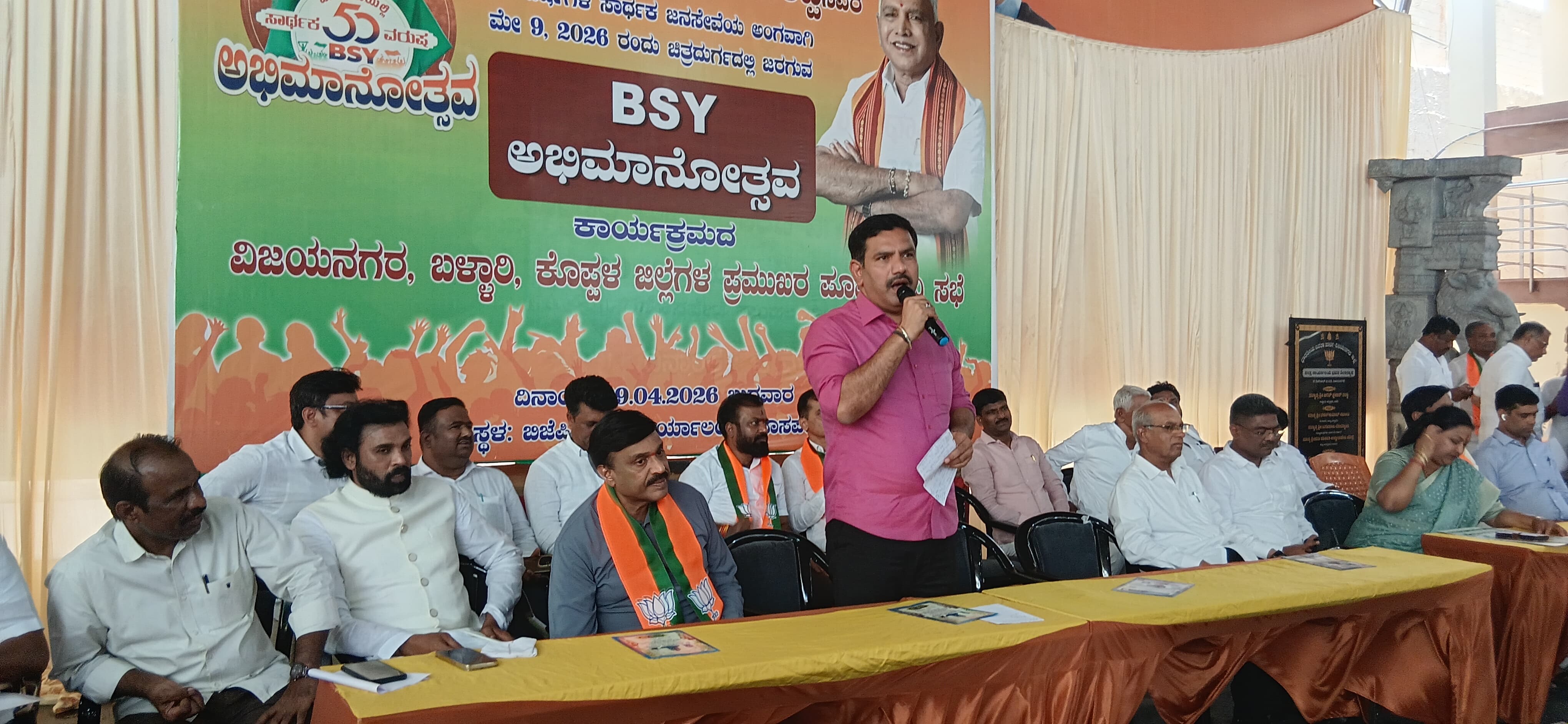 ನಗರದ ಬಿಜೆಪಿ ಕಚೇರಿಯಲ್ಲಿ ಬುಧವಾರ ನಡೆದ ಮಾಜಿ ಮುಖ್ಯಮಂತ್ರಿ ಬಿ.ಎಸ್. ಯಡಿಯೂರಪ್ಪ ಅವರ ೫೦ ವರ್ಷಗಳ ಸಾರ್ಥಕ ಜನಸೇವೆಯ ಅಂಗವಾಗಿ ಮೇ ೯ರಂದು ಚಿತ್ರದುರ್ಗದಲ್ಲಿ ನಡೆಯಲಿರುವ ಬಿಎಸ್ವೈ ಅಭಿಮಾನೋತ್ಸವ ಕಾರ್ಯಕ್ರಮದ ವಿಜಯನಗರ, ಬಳ್ಳಾರಿ, ಕೊಪ್ಪಳ ಜಿಲ್ಲೆಗಳ ಪ್ರಮುಖರ ಪೂರ್ವಭಾವಿ ಸಭೆಯ ಅಧ್ಯಕ್ಷತೆ ವಹಿಸಿ ಅವರು ಮಾತನಾಡಿದರು.