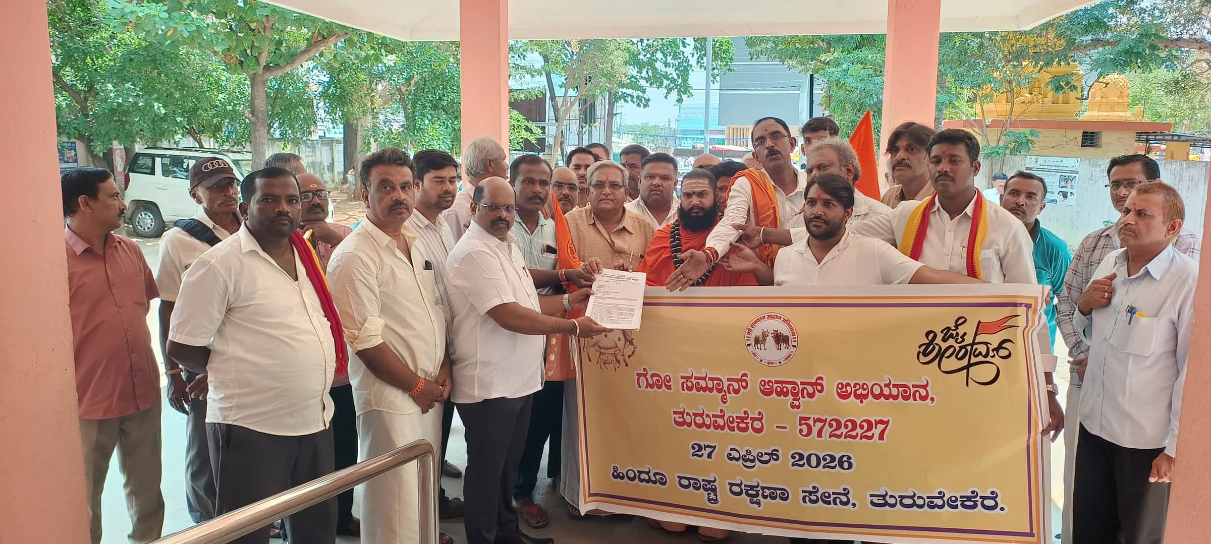 ತುರುವೇಕೆರೆ: ಗೋವನ್ನು ರಾಷ್ಟ್ರೀಯ ಪ್ರಾಣಿಯೆಂದು ಘೋಷಿಸಿ ಗೋ ಸಂಪತ್ತನ್ನು ರಕ್ಷಿಸಬೇಕೆಂದು ಹಿಂದೂ ರಾಷ್ಟ್ರ ರಕ್ಷಣಾ ಸೇನೆಯು ರಾಷ್ಟ್ರಪತಿಗಳನ್ನು ಆಗ್ರಹಿಸಿದೆ. ಗೋಮಾತೆಯ ಗೌರವದ ಅಭಿಯಾನ ಆಹ್ವಾನ ವೇದಿಕೆಯಡಿ ಪಟ್ಟಣದ ಪ್ರಮುಖ ರಸ್ತೆಗಳಲ್ಲಿ ಗೋ ಉಳಿಸುವ ಸಂಬಂಧ ಘೋಷಣೆ ಕೂಗಿದ ಹಿಂದೂ ರಾಷ್ಟ್ರ ರಕ್ಷಣಾ ಸೇನೆಯ ಕಾರ್ಯಕರ್ತರು ತಹಸೀಲ್ದಾರ್ ಮೂಲಕ ರಾಷ್ಟ್ರಪತಿಗಳು, ಪ್ರಧಾನ ಮಂತ್ರಿ, ಮುಖ್ಯಮಂತ್ರಿಗಳು, ರಾಜ್ಯಪಾಲರಿಗೆ ಮನವಿ ಪತ್ರವನ್ನು ಸಲ್ಲಿಸಿದರು.