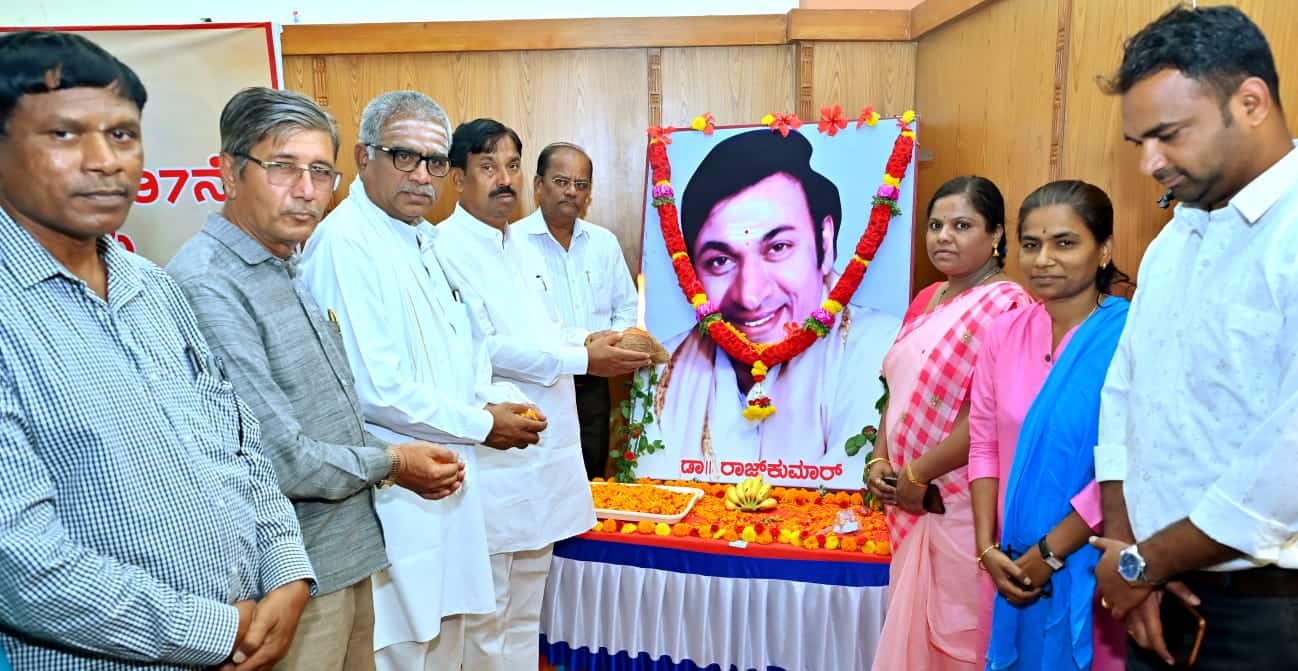 ಹಾವೇರಿ ನಗರದ ಗಾಂಧಿ ಭವನದಲ್ಲಿ ಶುಕ್ರವಾರ ವರನಟ ಡಾ.ರಾಜಕುಮಾರ್ ಅವರ ಭಾವಚಿತ್ರಕ್ಕೆ ಪುಷ್ಪಾರ್ಚನೆ ಮಾಡುವ ಮೂಲಕ 97ನೇ ಜಯಂತಿ ಆಚರಿಸಲಾಯಿತು. | Kannada Prabha