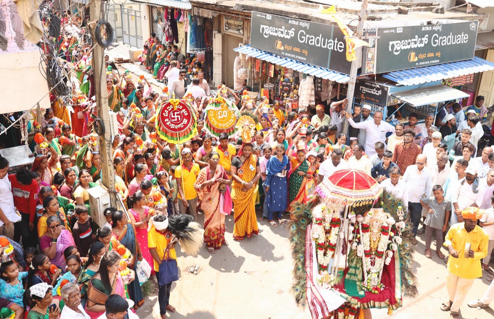 ಸ್ಥಳೀಯ ಜವಳಿ ಬಜಾರದಲ್ಲಿ ಶುಕ್ರವಾರ ಬೆಳಗ್ಗೆ ಜರುಗಿದ ಯಲ್ಲಮ್ಮ ದೇವಿ ದೇವಸ್ಥಾನದ ಕಳಸಾರೋಹಣ, ಮಲ್ಲೆಮ್ಮ ದೇವಿ ದೇವಸ್ಥಾನ ಮೂರ್ತಿ ಪ್ರತಿಷ್ಠಾಪನೆ ಹಾಗೂ ಧರ್ಮಸಭೆಯ ಸಾನ್ನಿಧ್ಯ ವಹಿಸಿ ಆಶೀರ್ವಚನ ನೀಡಿದ ಅವರು, ಒಂದಾನೊಂದು ಕಾಲದಲ್ಲಿ ಈ ಜವಳಿ ಬಜಾರ ವೈಭವದ ಓಣಿಯಾಗಿತ್ತು. ಇಲ್ಲಿಂದ ದಾವಣಗೆರೆಗೆ ಸೀರೆ ಒಯ್ದು ಅಲ್ಲಿಂದ ನೂಲು ತಂದು ಮತ್ತೆ ಸೀರೆ ತಯಾರಿಸುತ್ತಿದ್ದರು. ಪಟ್ಟಣದ ಪ್ರಮುಖ ವ್ಯಾಪಾರ ಕೇಂದ್ರವಾಗಿ ಹೃದಯ ಭಾಗವಾಗಿತ್ತು. ಈ ಪ್ರದೇಶದಲ್ಲಿ ಅರ್ಧ ಶತಮಾನಗಳ ಹಿಂದೆ ನಿರ್ಮಿಸಿದ ಯಲ್ಲಮ್ಮನ ಗುಡಿ ಕಳಸಾರೋಹಣ ನೆರವೇರಿಸಿದ್ದು, ಸಾರ್ಥಕ ಕ್ಷಣ ಇದು ಪ್ರತಿಯೊಬ್ಬರಿಗೂ ದೇವರ ಸಾನ್ನಿಧ್ಯ ಒದಗಿಸುವ ಕೆಲಸ ಎಂದರು.