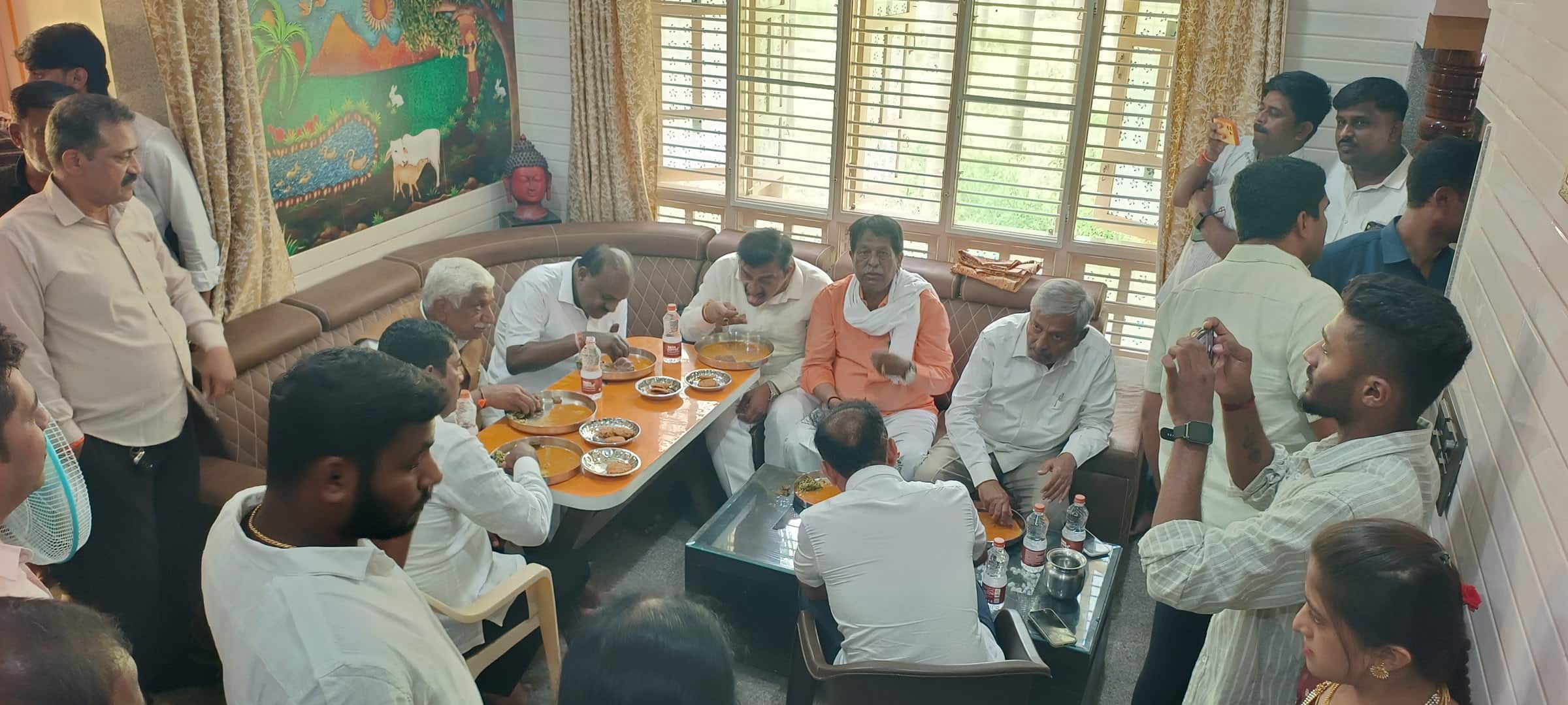 ಜೆಡಿಎಸ್ ಕಾರ್ಯಕರ್ತನ ಮನೆಯಲ್ಲಿ ಮಾಜಿ ಮುಖ್ಯಮಂತ್ರಿ ಹಾಗೂ ಕೇಂದ್ರ ಸಚಿವರಾಗಿರುವ ಎಚ್.ಡಿ.ಕುಮಾರಸ್ವಾಮಿ ಮುದ್ದೆ, ಸೊಪ್ಪಿನ ಸಾರು, ಅನ್ನ, ಮೊಸರು ಸವಿದು ಕಾರ್ಯಕರ್ತನ ಮನಸ್ಸಿಗೆ ಮುದ ನೀಡಿದರು.