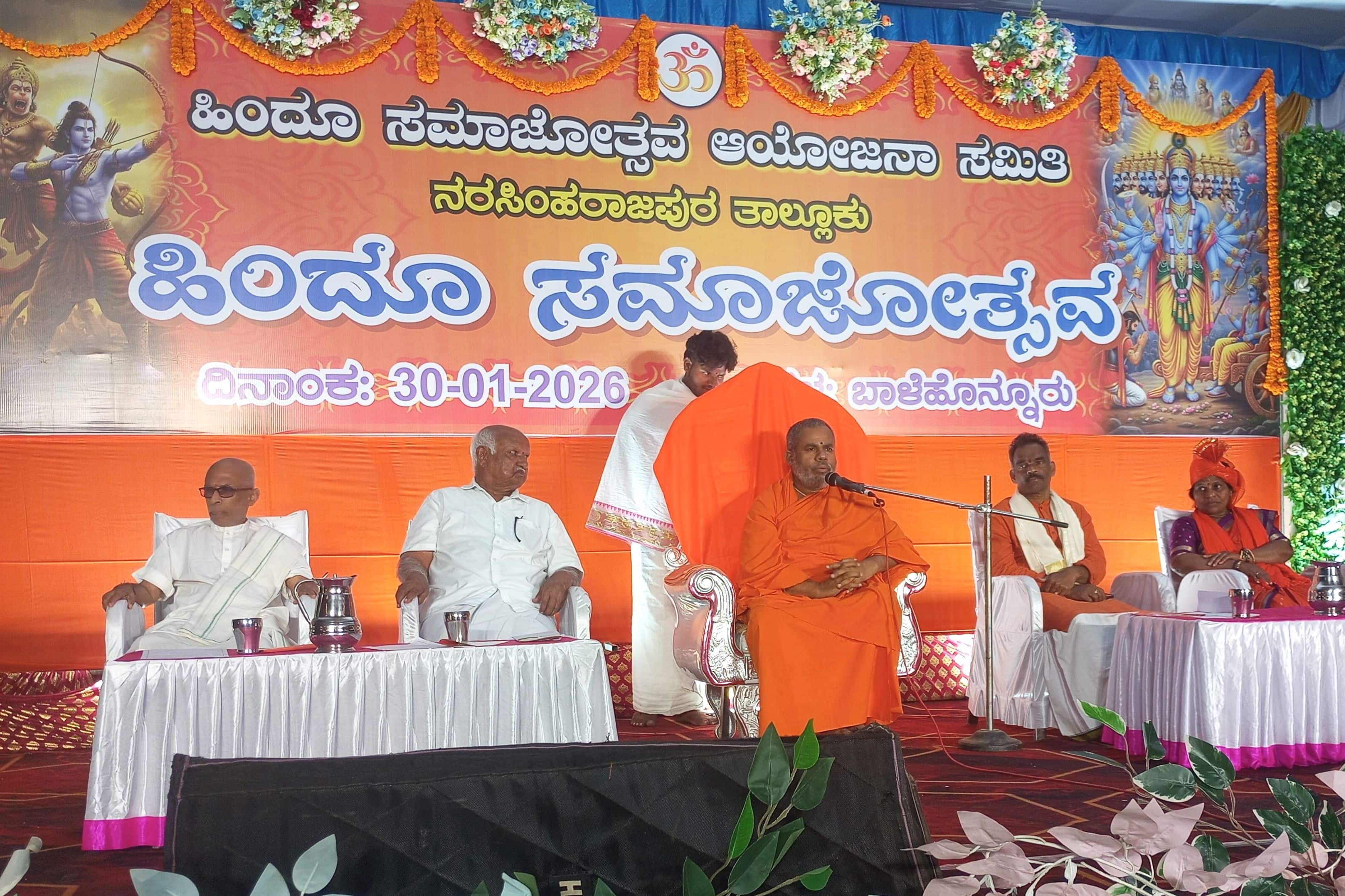 ನಾವುಗಳು ಅನ್ಯ ವಿಚಾರದ ಹಿಂದೆ ಓಡದೆ ಭಾರತದ ಪರಂಪರೆ ಜೀವನವನ್ನು ಒಪ್ಪಿ, ಅಳವಡಿಸಿಕೊಂಡು ನಮ್ಮ ಮಕ್ಕಳಿಗೆ ಕಲಿಸುತ್ತ ಬದುಕಬೇಕಿದೆ. ಈ ನಿಟ್ಟಿನಲ್ಲಿ ನಮ್ಮನ್ನು ನಾವು ಮರೆತವರಿಗೆ ಜಾಗೃತಗೊಳಿಸಲು ಹಿಂದೂ ಸಮಾಜೋತ್ಸವ ಆಯೋಜಿಸಲಾಗಿದೆ. ಭವಿಷ್ಯದ ಮುನ್ನಡೆಯ ಒಂದು ಸುಂದರ ಲಕ್ಷಣ ಇದಾಗಿದೆ. ತನ್ನ ಸಮಾಜೋತ್ಸವವನ್ನು ತಾನೇ ಆಚರಿಸಿಕೊಳ್ಳುತ್ತಿದೆ ಎಂದರು.ಆದಿಚುಂಚನಗಿರಿ ಶೃಂಗೇರಿ ಶಾಖಾ ಮಠದ ಶ್ರೀ ಗುಣನಾಥ ಸ್ವಾಮೀಜಿ ಸಾನಿಧ್ಯ ವಹಿಸಿ ಆಶೀರ್ವಚನ ನೀಡಿ, ಭಾರತೀಯ ಸಂಸ್ಕೃತಿ ವಿಶಾಲ, ಶ್ರೇಷ್ಠ, ಪವಿತ್ರವಾದ ಸಂಸ್ಕೃತಿಯಾಗಿದ್ದು, ನಮ್ಮ ಆಚರಣೆಗಳಲ್ಲಿ ಸಂಸ್ಕೃತಿ ಬಿಂಬ ಪ್ರತಿಬಿಂಬಿಸುತ್ತಿದೆ ಎಂದರು.ಹಿಂದೂ ಸಂಪ್ರದಾಯದಲ್ಲಿ ಆಚರಣೆಗಳು ಒಂದು ಭಾಗವಾಗಿವೆ. ಆದರೆ ಹಿಂದುತ್ವದಲ್ಲಿ ಜ್ಞಾನಕ್ಕೆ ಹೆಚ್ಚು ಮಹತ್ವ ಕೊಡಲಾಗಿದೆ. ಜೀವಾತ್ಮ-ಪರಮಾತ್ಮ ಬೇರೆ ಅಲ್ಲ ಎಂದು ಉಪನಿಷತ್ನಲ್ಲಿ ಹೇಳಲಾಗಿದೆ. ನಮ್ಮಲ್ಲಿ ಇಂದು ದೊಡ್ಡ ಅಜ್ಞಾನ ತುಂಬಿದ್ದು, ಜಾತೀಯತೆ ಬಗ್ಗೆ ಅಜ್ಞಾನ ಹೊಂದಿ ಸಂಕುಚಿತ ಭಾವನೆ ತಾಳಿದ್ದೇವೆ. ಸಭಾ ಕಾರ್ಯಕ್ರಮಕ್ಕೂ ಮುನ್ನ ಮಾರ್ಕಾಂಡೇಶ್ವರ ದೇವಸ್ಥಾನದ ಆವರಣದಲ್ಲಿ ಹಿರಿಯ ಕಾಫಿ ಬೆಳೆಗಾರ ಎಂ.ಎಸ್.ಚನ್ನಕೇಶವಗೌಡ ಗೋ ಪೂಜೆ ಮಾಡುವ ಮೂಲಕ ಬೃಹತ್ ಶೋಭಾಯಾತ್ರೆಗೆ ಚಾಲನೆ ನೀಡಿದರು. ಶೋಭಾಯಾತ್ರೆಯಲ್ಲಿ ಹಲಗೆ, ಓಲಗ, ನಾಸಿಕ್ ಡೋಲು, ಚಂಡೆ, ವಿವಿಧ ವೇಷಭೂಷಣಗಳನ್ನು ತೊಟ್ಟ ಪುಟಾಣಿಗಳ ಸ್ತಬ್ಧಚಿತ್ರ ನೋಡುಗರ ಗಮನ ಸೆಳೆಯಿತು. ಕೇಸರಿ ಶಾಲು ಹೊದ್ದು, ಧ್ವಜ ಹಿಡಿದ ಸಾವಿರಾರು ಮಹಿಳೆಯರು, ಪುರುಷರು ಪಟ್ಟಣದ ಮುಖ್ಯರಸ್ತೆಗಳಲ್ಲಿ ಶೋಭಾಯಾತ್ರೆಯಲ್ಲಿ ಪಾಲ್ಗೊಂಡಿದ್ದರು.ಕಾಫಿ ಬೆಳೆಗಾರ ಕೆ.ಎನ್.ರುದ್ರಪ್ಪಗೌಡ, ಹಿಂದೂ ಸಮಾಜೋತ್ಸವ ಆಯೋಜನಾ ಸಮಿತಿ ತಾಲೂಕು ಅಧ್ಯಕ್ಷ ಎ.ಎಸ್.ಕೃಷ್ಣಯ್ಯ, ಉಪಾಧ್ಯಕ್ಷ ಆರ್.ಡಿ.ಮಹೇಂದ್ರ, ಸಹ ಸಂಯೋಜಕ ಬಿ.ವೆಂಕಟೇಶ್, ಮಹಿಳಾ ಪ್ರಮುಖ್ ಪ್ರೇಮಲತಾ, ಸಿ.ಎಸ್.ಮಹೇಶ್ಚಂದ್ರ, ಸಿರಿ ಆರಾಧ್ಯ, ಸತೀಶ್ ಅರಳೀಕೊಪ್ಪ, ಸಂದೀಪ್ ಶೆಟ್ಟಿ, ರತ್ನಾಕರ ಗಡಿಗೇಶ್ವರ, ಉಮೇಶ್, ಅರುಣ್ಕುಮಾರ್ ಹಾಜರಿದ್ದರು.೩೧ಬಿಹೆಚ್ಆರ್ ೧: ಬಾಳೆಹೊನ್ನೂರಿನಲ್ಲಿ ನಡೆದ ಹಿಂದೂ ಸಮಾಜೋತ್ಸವ ಕಾರ್ಯಕ್ರಮದಲ್ಲಿ ಆದಿಚುಂಚನಗಿರಿ ಶೃಂಗೇರಿ ಶಾಖಾ ಮಠದ ಶ್ರೀ ಗುಣನಾಥ ಸ್ವಾಮೀಜಿ ಆಶೀರ್ವಚನ ನೀಡಿದರು. ಸೀತಾರಾಮ ಕೆದಿಲಾಯ, ಕೆ.ಎನ್.ರುದ್ರಪ್ಪಗೌಡ, ಎ.ಎಸ್.ಕೃಷ್ಣಯ್ಯ, ಪ್ರೇಮಲತಾ ಇದ್ದರು.೩೧ಬಿಹೆಚ್ಆರ್ ೨: ಬಾಳೆಹೊನ್ನೂರಿನಲ್ಲಿ ಹಿಂದೂ ಸಮಾಜೋತ್ಸವದ ಅಂಗವಾಗಿ ಸಾವಿರಾರು ಹಿಂದೂ ಬಾಂಧವರು ಬೃಹತ್ ಶೋಭಾಯಾತ್ರೆ ನಡೆಸಿದರು.