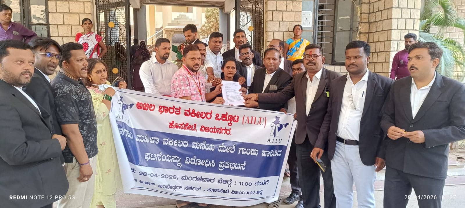 ಹೊಸಪೇಟೆ: ಬೆಳಗಾವಿ ಮಹಿಳಾ ವಕೀಲೆ ಪೂಜಾ ಕಾಕಟಕರ್ ಅವರ ಮನೆಯ ಮೇಲೆ ಗುಂಡು ಹಾರಿಸಿದ ದುಷ್ಕರ್ಮಿಗಳನ್ನು ಶೀಘ್ರ ಬಂಧಿಸುವಂತೆ ಒತ್ತಾಯಿಸಿ ನಗರದಲ್ಲಿ ಮಂಗಳವಾರ ಅಖಿಲ ಭಾರತ ವಕೀಲರ ಒಕ್ಕೂಟದಿಂದ ಪ್ರತಿಭಟನೆ ನಡೆಸಿ, ಉಪ ತಹಸೀಲ್ದಾರ್ ಮಂಜುನಾಥ ಅವರಿಗೆ ಮನವಿ ಸಲ್ಲಿಸಿದರು.