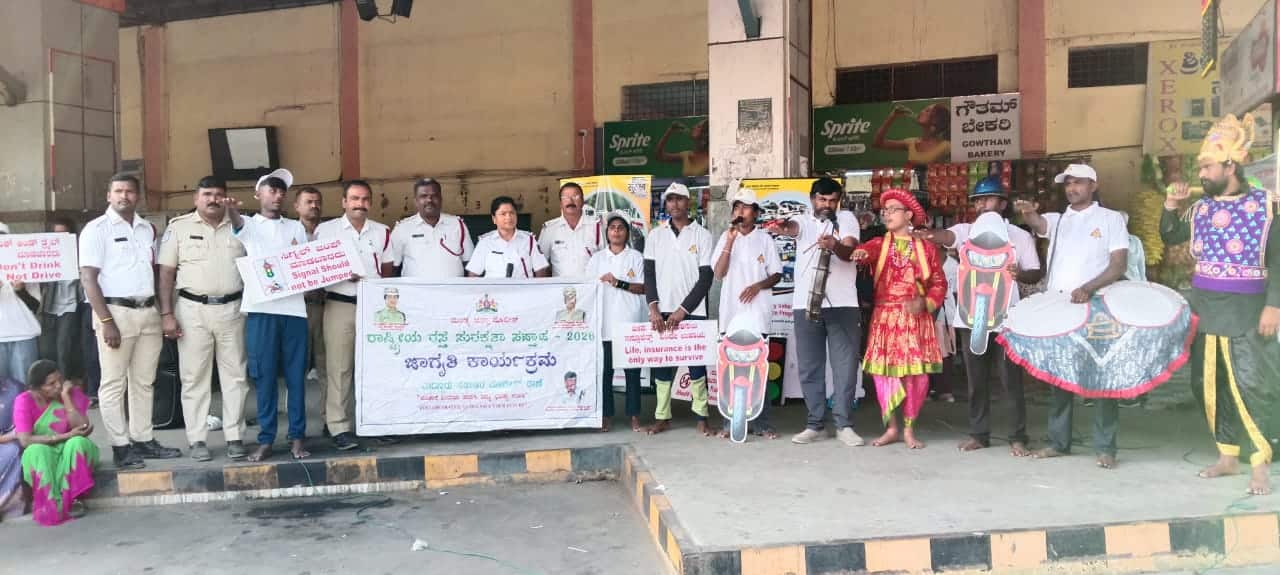 ಈ ವೇಳೆ ಸಂಚಾರಿ ಠಾಣೆ 1ನೇಪಿಎಸ್ಐ ರಾಮಸ್ವಾಮಿ, ಕಲಾತಂಡದ ಮುಖ್ಯಸ್ಥ ಚಿಕ್ಕ ರೆಡ್ಡಪ್ಪ, ಎಎಸ್ಐ ರಮೇಶ್ ಹಾಗೂ ಸಂಚಾರಿ ಠಾಣೆ ಸಿಬ್ಬಂದಿ ಕಾರ್ಯಕ್ರಮದಲ್ಲಿ ಭಾಗವಹಿಸಿದ್ದರು.ರಸ್ತೆ ಅಪಘಾತ: ಬೈಕ್ ಸವಾರನಿಗೆ ಗಂಭೀರ ಗಾಯಹಲಗೂರು: ಎರಡು ಬೈಕ್ಗಳ ನಡುವೆ ನಡೆದ ರಸ್ತೆ ಅಪಘಾತದಲ್ಲಿ ಓರ್ವ ಬೈಕ್ ಸವಾರನ ಕಾಲಿಗೆ ತೀವ್ರ ಪೆಟ್ಟಾಗಿರುವ ಘಟನೆ ರಾಷ್ಟ್ರೀಯ ಹೆದ್ದಾರಿ- 948 ರ ತೊರೆಕಾಡನಹಳ್ಳಿ ಗೇಟ್ ಬಳಿ ನಡೆದಿದೆ. ಸಮೀಪದ ಕೆಂಪಯ್ಯನದೊಡ್ಡಿ ಗ್ರಾಮದ ದೇವರಾಜು ಬೆಂಗಳೂರು ಜಲಮಂಡಳಿಯಲ್ಲಿ ಕೆಲಸ ಮಾಡುತ್ತಿದ್ದರು. ಕಾರ್ಯ ನಿಮಿತ್ತ ಹೊರಗೆ ಬಂದಿದ್ದ ಈತ ಬೆಂಗಳೂರು ಜಲ ಮಂಡಳಿ ಒಳಗೆ ಹೋಗಲು ಬೈಕ್ ತಿರುಗಿಸಿಕೊಳ್ಳುತ್ತಿದಾಗ ಹಿಂಬದಿಯಿಂದ ಬಂದ ಮೊತ್ತೊಂದು ಬೈಕ್ ಸವಾರ ಡಿಕ್ಕಿ ಹೊಡೆದಿದ್ದಾನೆ. ಡಿಕ್ಕಿ ಹೊಡೆದ ರಭಸಕ್ಕೆ ದೇವರಾಜು ಬಲಗಾಲಿಗೆ ಗಂಭೀರ ಗಾಯಗಳಾಗಿದ್ದು, ಮೈಸೂರು ಖಾಸಗಿ ಆಸ್ಪತ್ರೆಯಲ್ಲಿ ಚಿಕಿತ್ಸೆ ಪಡೆಯುತ್ತಿದ್ದಾರೆ. ಈ ಸಂಬಂಧ ಹಲಗೂರು ಪೊಲೀಸ್ ಠಾಣೆಯಲ್ಲಿ ಪ್ರಕರಣ ದಾಖಲಾಗಿದೆ.
