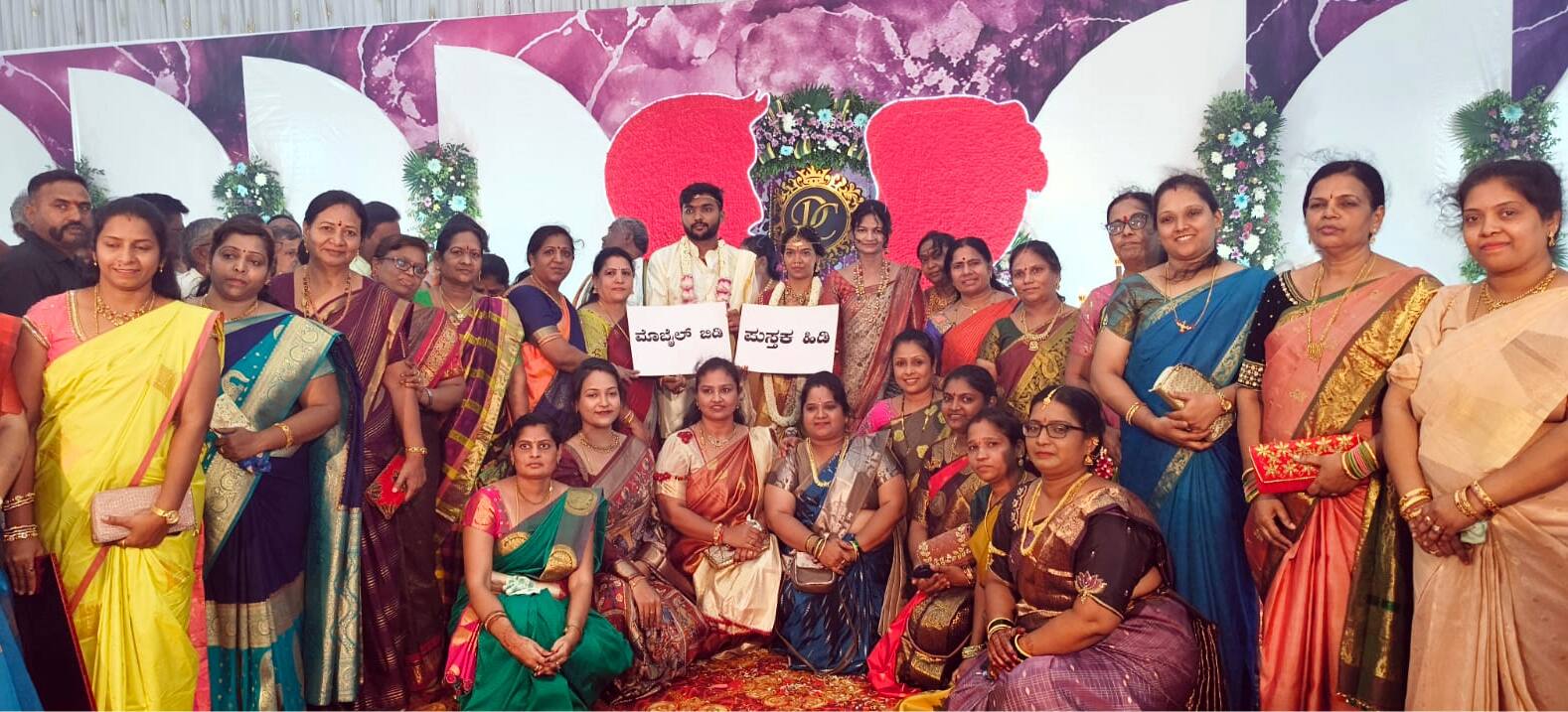 ಕುಷ್ಟಗಿ: ಪಟ್ಟಣದ ಪಿಸಿಎಚ್ ಕಲ್ಯಾಣ ಮಂಟಪದಲ್ಲಿ ನಡೆದ ಶೆಟ್ಟರ್ ಬಂಧುಗಳ ಮದುವೆ ಸಮಾರಂಭದಲ್ಲಿ ಮೊಬೈಲ್ ಬಿಡಿ ಪುಸ್ತಕ ಹಿಡಿ ಎಂಬ ವಿನೂತನ ಜಾಗೃತಿ ಅಭಿಯಾನ ಆಯೋಜಿಸಿ ಓದುಗ ಸಂಸ್ಕೃತಿ ಬೆಳೆಸುವ ಪ್ರಯತ್ನ ಕೈಗೊಳ್ಳಲಾಯಿತು. ಮದುವೆ ಸಮಾರಂಭದಲ್ಲಿ ನವ ವಧು-ವರರು ಮೊಬೈಲ್ ಬಿಡಿ ಪುಸ್ತಕ ಹಿಡಿ ಅಭಿಯಾನ ಜಾಗೃತಿ ಮೂಡಿಸಿ ಗಮನ ಸೆಳೆದರು. ನೂತನ ವಧು-ವರ ದರ್ಶನ್ ಶೆಟ್ಟರ್ ಹಾಗೂ ಚೈತ್ರ ಮೊಬೈಲ್ ಬಿಡಿ ಪುಸ್ತಕ ಹಿಡಿ ಅಭಿಯಾನ ಜಾಗೃತಿ ಎಂಬ ಬರಹ ಪ್ರದರ್ಶಿಸಿ ಗಮನ ಸೆಳೆದರು.ಮದುವೆಗೆ ಬಂದ ಕುಟುಂಬದವರು, ಬೀಗರು ಸ್ನೇಹಿತರು ಈ ಮಾದರಿ ಮದುವೆಯ ಈ ಸಂದೇಶ ಮೆಚ್ಚಿಕೊಂಡರಲ್ಲದೇ ವಿಶೇಷವಾಗಿ ಜಾಗೃತಿ ಮಾಡಿರುವ ಕಾರ್ಯ ಶ್ಲಾಘನೀಯ ಎಂದು ಪ್ರಶಂಸೆ ವ್ಯಕ್ತಪಡಿಸಿದರು.ದರ್ಶನ್ ಶೆಟ್ಟರ್ ಮಾತನಾಡಿ, ಇಂದಿನ ಯುಗದಲ್ಲಿ ಮೊಬೈಲ್ ಫೋನ್ ನಮ್ಮ ಜೀವನದ ಅವಿಭಾಜ್ಯ ಭಾಗವಾಗಿದೆ. ಮಕ್ಕಳು ಮತ್ತು ಯುವಕರು ಹೆಚ್ಚು ಸಮಯ ಮೊಬೈಲ್ನಲ್ಲಿ ಕಳೆಯುತ್ತಾರೆ. ಆಟ, ಸಾಮಾಜಿಕ ಜಾಲತಾಣ, ವಿಡಿಯೋ ನೋಡುವುದರಿಂದ ಅವರು ಪುಸ್ತಕ ಓದುವುದನ್ನು ಮರೆಯುತ್ತಿದ್ದಾರೆ. ಆದ್ದರಿಂದ ನಮ್ಮ ವಿವಾಹ ಸಂದರ್ಭದಲ್ಲಿ ಮೊಬೈಲ್ ಬಿಡಿ, ಪುಸ್ತಕ ಹಿಡಿ ಎಂಬ ಸಂದೇಶ ನೀಡುವ ಮೂಲಕ ಜಾಗೃತಿ ಮೂಡಿಸಲಾಗುತ್ತಿದೆ. ಪುಸ್ತಕಗಳು ನಮ್ಮ ಉತ್ತಮ ಸ್ನೇಹಿತರು. ನಮಗೆ ಜ್ಞಾನ ಕೊಡುತ್ತವೆ, ಉತ್ತಮ ಚಿಂತನೆ ಬೆಳೆಸುತ್ತವೆ ಮತ್ತು ನಮ್ಮ ಭವಿಷ್ಯ ಬೆಳಗಿಸುತ್ತವೆ. ಪುಸ್ತಕಗಳನ್ನು ಓದುವುದರಿಂದ ನಮ್ಮ ಭಾಷಾ ಕೌಶಲ್ಯ ವೃದ್ಧಿಯಾಗುತ್ತದೆ, ಮನಸ್ಸು ಏಕಾಗ್ರತೆಯಾಗುತ್ತದೆ ಎಂದು ತಿಳಿಸಿದರು.