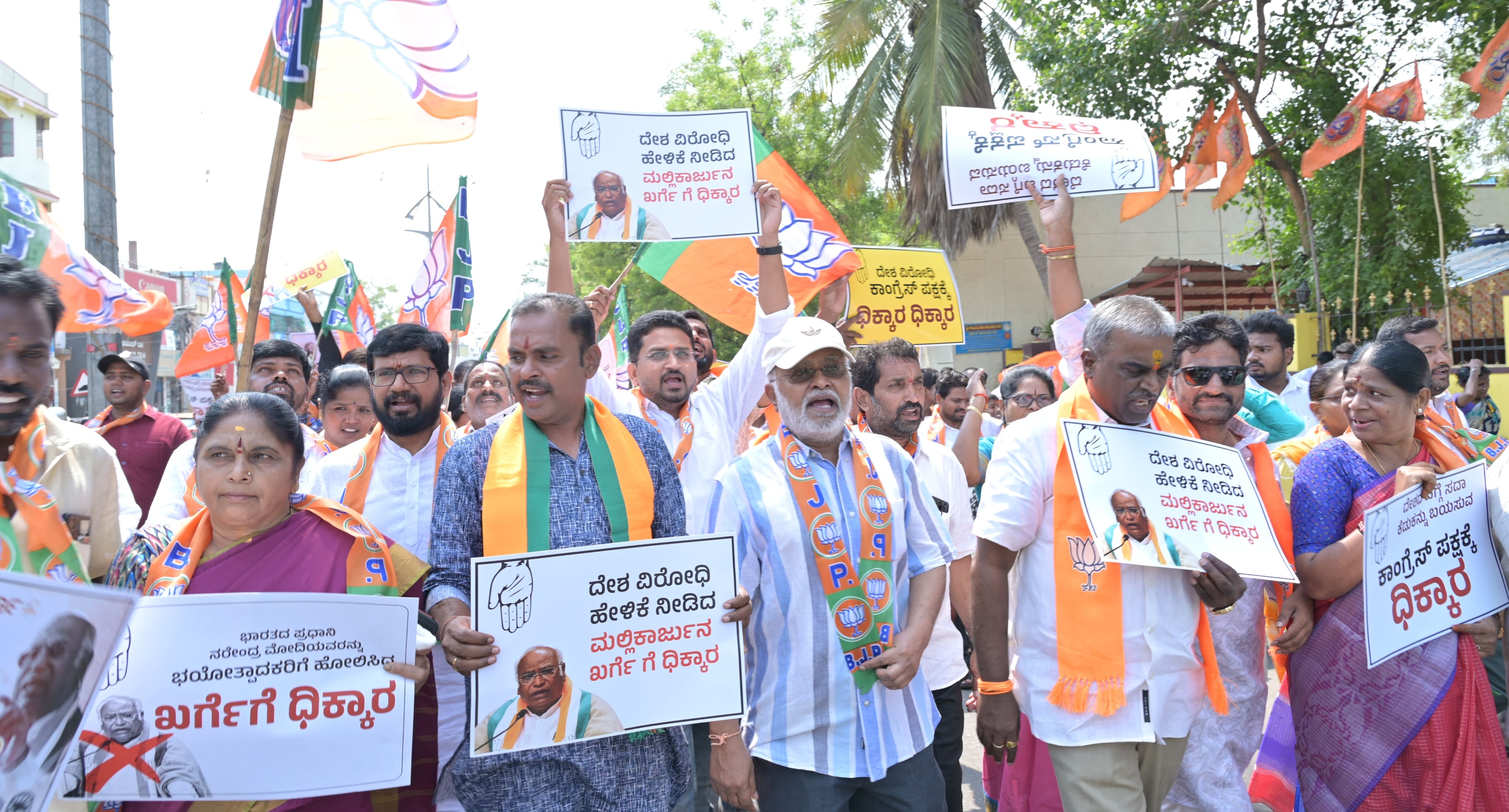 ನಗರದ ಇನ್ ಪ್ಯಾಂಟ್ರಿ ರಸ್ತೆಯಲ್ಲಿರುವ ಜಿಲ್ಲಾ ಕಾಂಗ್ರೆಸ್ ಕಚೇರಿಗೆ ಮುತ್ತಿಗೆ ಹಾಕಲು ಕುಮಾರಸ್ವಾಮಿ ದೇವಸ್ಥಾನದಿಂದ ಕಾಂಗ್ರೆಸ್ ಪಕ್ಷ ಹಾಗೂ ಮಲ್ಲಿಕಾರ್ಜುನ ಖರ್ಗೆ ವಿರುದ್ಧ ಘೋಷಣೆಗಳನ್ನು ಕೂಗಿಕೊಂಡು ಮೆರವಣಿಗೆ ಹೊರಟ ಬಿಜೆಪಿ ಕಾರ್ಯಕರ್ತರನ್ನು ದಾರಿ ಮಧ್ಯದಲ್ಲಿ ಪೊಲೀಸರು ತಡೆಯಲು ಯತ್ನಿಸಿದರು. ಇದರಿಂದ ಬಿಜೆಪಿ ಕಾರ್ಯಕರ್ತರು ಹಾಗೂ ಪೊಲೀಸರ ನಡುವೆ ಕೆಲ ಹೊತ್ತು ವಾಗ್ವಾದ ನಡೆಯಿತು. ಬಳಿಕ, ಪ್ರತಿಭಟನಾಕಾರರನ್ನು ಪೊಲೀಸರು ಬಂಧಿಸಿದರು.