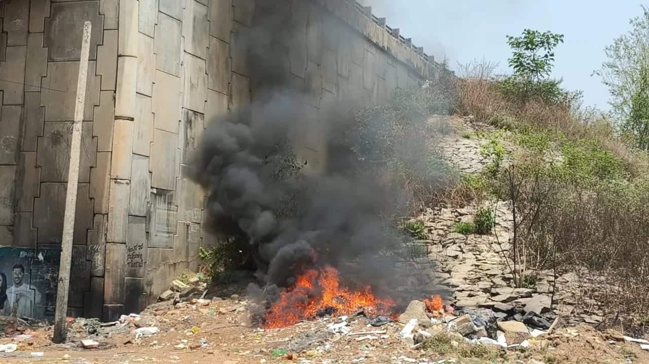 ಸಿಕೆಬಿ-1 ನಗರ ಹೊರವಲಯದ ಮಹಿಳಾ ಕಾಲೇಜು ಸಮೀಪ ಲೋಡ್ಗಟ್ಟಲೆ ಪ್ಲಾಸ್ಟಿಕ್ ಬಟ್ಟೆ ಇತ್ಯಾದಿ ತ್ಯಾಜ್ಯಕ್ಕೆ ನಗರಸಭೆ ಸಿಬ್ಬಂದಿ ಮಟ ಮಟ ಮಧ್ಯಾಹ್ನವೇ ಬೆಂಕಿ ಹಚ್ಚಿರುವುದು