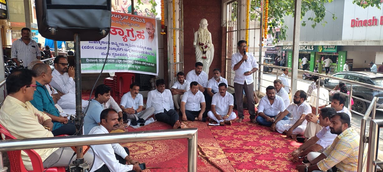 ಪುತ್ತೂರು: ಮಹಾತ್ಮ ಗಾಂಧಿ ರಾಷ್ಟ್ರೀಯ ಗ್ರಾಮೀಣ ಉದ್ಯೋಗ ಖಾತರಿ ಯೋಜನೆಯಲ್ಲಿ ಮಹಾತ್ಮ ಗಾಂಧಿ ಅವರ ಹೆಸರು ಬದಲಿ, ಯೋಜನೆಯ ಮೂಲ ಸ್ವರೂಪವನ್ನೇ ಬದಲಾಯಿಸಿರುವ ಕೇಂದ್ರ ಸರಕಾರದ ವಿರುದ್ಧ ಪುತ್ತೂರು, ವಿಟ್ಲ ಹಾಗೂ ಉಪ್ಪಿನಂಗಡಿ ಬ್ಲಾಕ್ ಕಾಂಗ್ರೆಸ್ ನೇತೃತ್ವದಲ್ಲಿ ಶುಕ್ರವಾರ ಪುತ್ತೂರಿನ ಬಸ್ ನಿಲ್ದಾಣ ಬಳಿಯ ಗಾಂಧಿಕಟ್ಟೆಯಲ್ಲಿ ಸತ್ಯಾಗ್ರಹ ನಡೆಸಿದರು.