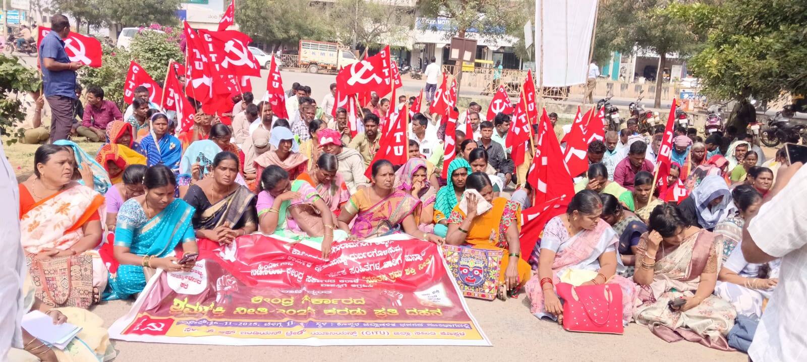 ಬೇಡಿಕೆಗಳು:ನ. 21ರಂದು 4 ಸಂಹಿತೆಗಳ ಅಧಿಸೂಚನೆ ರದ್ದುಗೊಳಿಸಬೇಕು. ರಾಜ್ಯ ಸರ್ಕಾರ ಈ ನಿಯಮ ರಚಿಸಬಾರದು. ಶ್ರಮಶಕ್ತಿ ನೀತಿ ಕೇಂದ್ರ ಸರ್ಕಾರ ಹಿಂಪಡೆಯಬೇಕು ಮತ್ತು ರಾಜ್ಯ ಸರ್ಕಾರ ಇದನ್ನು ತಿರಸ್ಕರಿಸಬೇಕು. ಕನಿಷ್ಠ ವೇತನದ ಮಂಡಳಿ ಶಿಫಾರಸ್ಸು ಮಾಡಿರುವ ಕರಡು ಅಧಿಸೂಚನೆ ಅಂತಿಮಗೊಳಿಸಿ ₹36 ಸಾವಿರ ಜಾರಿ ಮಾಡಬೇಕು. ರಾಜ್ಯದಲ್ಲಿ ಕಾರ್ಖಾನೆ ಕಾಯ್ದೆಗೆ ತಂದಿರುವ ತಿದ್ದುಪಡಿ ವಾಪಸ್ಸು ಪಡೆಯಬೇಕು. 12 ಗಂಟೆಗಳ ಕೆಲಸ ಕಡ್ಡಾಯ ಮಾಡಬಾರದು. ಕರ್ನಾಟಕ ಕಾರ್ಮಿಕ ಸಮ್ಮೇಳನ ರಚಿಸಬೇಕು, ಅಸಂಘಟಿತ ಕಾರ್ಮಿಕರ ಸಾಮಾಜಿಕ ಭದ್ರತಾ ಮಂಡಳಿಗೆ ಅನುದಾನ ಒದಗಿಸಿ,ನಿವೃತ್ತಿ ಸೌಲಭ್ಯ ಕೊಡಬೇಕು ಮತ್ತು ಸಾಮಾಜಿಕ ಭದ್ರತಾ ಸವಲತ್ತು ನೀಡಬೇಕು. ಇತ್ತೀಚಿಗೆ ಪ್ರಾರಂಭವಾಗಿರುವ ಅಸಂಘಟಿತ ಕಾರ್ಮಿಕರ ವಿವಿಧ ಮಂಡಳಿಗಳಿಗೆ ಬಜೆಟ್ನಲ್ಲಿ ಅನುದಾನ ಕಾಯ್ದಿರಿಸಬೇಕು ಮತ್ತು ಸೆಸ್ನ್ನು ಸಂಗ್ರಹಿಸಿ ಸಾಮಾಜಿಕ ಭದ್ರತಾ ಸೌಲಭ್ಯ ಕೊಡಬೇಕು ಸೇರಿದಂತೆ ಅನೇಕ ಬೇಡಿಕೆ ಒತ್ತಾಯಿಸಿದರು.ಈ ಸಂದರ್ಭದಲ್ಲಿ ಸಿಐಟಿಯು ರಾಜ್ಯ ಉಪಾಧ್ಯಕ್ಷ ಎಂ.ಬಿ. ನಾಡಗೌಡ, ಸಿಐಟಿಯು ರಾಜ್ಯ ಕಾರ್ಯದರ್ಶಿ ನಿರುಪಾದಿ ಬೆಣಕಲ್, ಸಿಐಟಿಯು ಜಿಲ್ಲಾಧ್ಯಕ್ಷ ಹನುಮೇಶ ಕಲ್ಮಂಗಿ, ಸಿಐಟಿಯು ಜಿಲ್ಲಾ ಪ್ರಧಾನ ಕಾರ್ಯದರ್ಶಿ ಮಂಜುನಾಥ ಡಗ್ಗಿ, ಸಿಐಟಿಯು ಜಿಲ್ಲಾ ಖಜಾಂಚಿ ಲಕ್ಷ್ಮಿ ದೇವಿ ಸೋನಾರ, ಎ.ರಮೇಶ್, ಚಂದ್ರಶೇಖರಗೌಡ ಹೇರೂರು, ದುರ್ಗಮ್ಮ ಹೊಸಕೇರಾ, ಗಂಗಮ್ಮ ಸಿದ್ದಾಪುರ, ಕೃಷ್ಣಪ್ಪ ನಾಯಕ್, ಅಂಬರೀಶ್ ಡಾಣಿ, ಇಮಾಮ್ ಗಂಗಾವತಿ, ಮಹಾರಾಜ್ ಭಾಗವಹಿಸಿದ್ದರು.