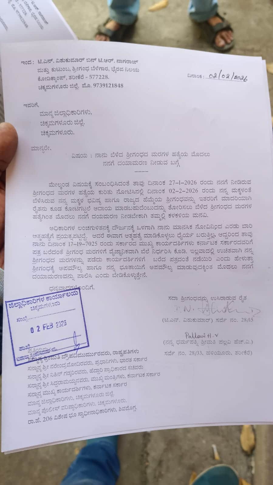 ಚಿಕ್ಕಮಗಳೂರು: ಬದುಕಿದ್ದಾಗಲೇ ತನ್ನ ತಿಥಿಗೆ ತರೀಕೆರೆ ತಾಲೂಕಿನ ಶ್ರೀಗಂಧದ ಬೆಳೆಗಾರ ವಿಶುಕುಮಾರ್ ಅಧಿಕಾರಿಗಳಿಗೆ ಆಹ್ವಾನ ನೀಡುವ ಮೂಲಕ ವಿಭಿನ್ನ ರೀತಿ ಆಕ್ರೋಶ ಹೊರಹಾಕಿದ್ದಾರೆ.ತಿಥಿ ಆಹ್ವಾನ ಪತ್ರಿಕೆಯಲ್ಲಿ ನಾಳೆ (ಫೆ.9ರಂದು) ಬೆಳಗ್ಗೆ 10ಕ್ಕೆ ಸಂತಾಪ ಸಭೆ, ಮಧ್ಯಾಹ್ನ 1 ಗಂಟೆಗೆ ಊಟಕ್ಕೆ ಕರೆದಿರುವ ಅವರು ದುಃಖ ತಪ್ತರು: ರಾಜ್ಯದ ಶ್ರೀಗಂಧ ಬೆಳೆಗಾರರು, ಕನ್ನಡನಾಡಿನ ಜನ ಮತ್ತು ರೈತರು ಎಂದು ಹಾಕಿಸಿದ್ದರೆಸಂತಾಪ ಸಭೆಯಲ್ಲಿ ಭಾಗವಹಿಸುವವರು ಎನ್.ಎಚ್.ಎ.ಐ.ನ ಅಧಿಕಾರಿಗಳು, ಅರಣ್ಯ ಇಲಾಖೆ ಭಷ್ಟ ಅಧಿಕಾರಿಗಳುಪೊಲೀಸ್ ಇಲಾಖೆ ಒಳ್ಳೆಯ ಅಧಿಕಾರಿಗಳು, ವಿಶೇಷ ಭೂಸ್ವಾದೀನ ಅಧಿಕಾರಿಗಳು ಎಂದು ಹಾಕಿಸಿದ್ದಾರೆ.ವಿಶುಕುಮಾರ್ ವಾರದ ಹಿಂದೆ ಜಿಲ್ಲಾಧಿಕಾರಿಗಳಿಗೆ ಮನವಿ ಸಲ್ಲಿಸಿ ನಾನು ಬೆಳೆದ ಶ್ರೀಗಂಧ ಮರಗಳ ಹತ್ಯೆಯ ಮೊದಲು ತನಗೆ ದಯಾಮರಣ ನೀಡಬೇಕೆಂದು ಮನವಿ ಮಾಡಿ ಶ್ರೀಗಂಧ ಮರಗಳನ್ನು ಮಕ್ಕಳಂತೆ ಬೆಳೆಸಿದ್ದು ಅಧಿಕಾರಿಗಳ ಲಂಚಗುಳಿತನಕ್ಕೆ ಬೇಸತ್ತು, ನೊಂದು 2 ಬಾರಿ ಆತ್ಮಹತ್ಯೆಗೆ ಪ್ರಯತ್ನ ಪಟ್ಟಿದ್ದೆ ಆದರೆ ಈಗ ಧೈರ್ಯ ಸಾಲುತ್ತಿಲ್ಲ ದಯವಿಟ್ಟು ಅಧಿಕಾರಿಗಳಿಗೆ ಬರೆದ ಪತ್ರದಂತೆ ಶ್ರೀಗಂಧಕ್ಕೆ ವೈಜ್ಞಾನಿಕ ಬೆಲೆ ನೀಡಿ ಖರೀದಿಸಿ ಅಥವಾ ದಯಾಮರಣ ನೀಡಿ ಎಂದು ಮನವಿಯಲ್ಲಿ ತಿಳಿಸಿದ್ದರು.ರಾಷ್ಟ್ರೀಯ ಹೆದ್ದಾರಿಯಲ್ಲಿರುವ ಇವರ ಜಮೀನಿನ ಗಂಧದ ಮರಗಳು ಹೋಗುತ್ತಿವೆ ಅದಕ್ಕೆ ಸೂಕ್ತ ಪರಿಹಾರ ನೀಡದಿದ್ದಕ್ಕೆ ಸರ್ಕಾರ ಹಾಗೂ ಅಧಿಕಾರಿಗಳ ವಿರುದ್ಧ ಈ ವಿಭಿನ್ನ ಹೊರಾಟಕ್ಕೆ ಮುಂದಾಗಿದ್ದಾರೆ. ಒಂದು ಗಂಧದ ಮರಕ್ಕೆ ಕೇವಲ ₹420 ನಿಗದಿ ಮಾಡಿರುವ ಅರಣ್ಯಾಧಿಕಾರಿಗಳು, 1 ಮಾವಿನ ಮರಕ್ಕೆ ₹63 ಸಾವಿರ, ತೆಂಗಿಗೆ ₹37 ಸಾವಿರ, ಬೇವಿಗೆ ₹2200, ನಿಂಬೆಗೆ ₹3400 ನೀಡಿ ಶ್ರೀಗಂಧಕ್ಕೆ ಕೇವಲ ₹420 ನಿಗದಿ ಮಾಡಿದ್ದು ಕೋರ್ಟ್ ವೈಜ್ಞಾನಿಕ ದರ ₹25 ಸಾವಿರ ನೀಡುವಂತೆ ಸೂಚಿಸಿದ್ದರೂ ಈ ಬಗ್ಗೆ ಕ್ರಮ ಕೈಗೊಳ್ಳದ ಆರೋಪಿಸಿದ್ದಾರೆ ಬೆಳೆಗಾರ ವಿಶುಕುಮಾರ್..