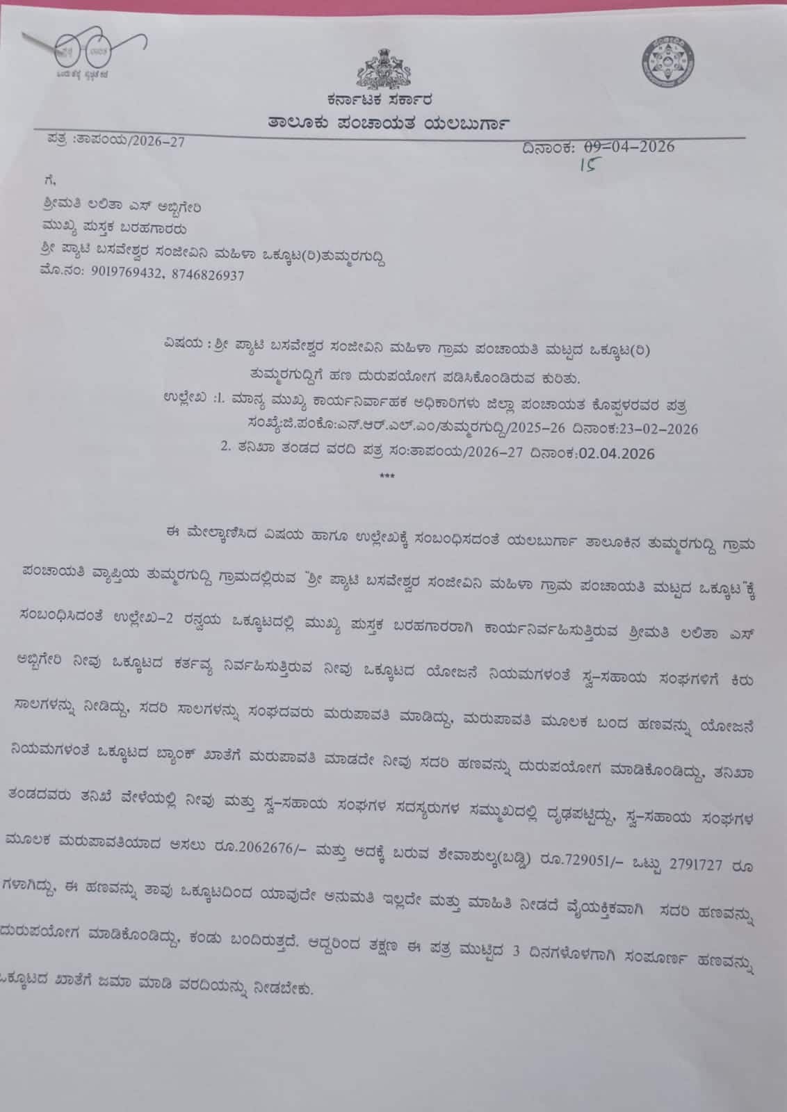 ಯಲಬುರ್ಗಾ: ತಾಲೂಕಿನ ತುಮ್ಮರಗುದ್ದಿ ಪ್ಯಾಟಿ ಬಸವೇಶ್ವರ ಸಂಜೀವಿನಿ ಮಹಿಳಾ ಒಕ್ಕೂಟದಲ್ಲಿ ನಡೆದಿದೆ ಎನ್ನಲಾದ ಹಣಕಾಸಿನ ಅವ್ಯವಹಾರದ ಬಗ್ಗೆ ತನಿಖಾ ತಂಡದ ಅಧಿಕಾರಿಗಳು ಜಿಪಂಗೆ ವರದಿ ಸಲ್ಲಿಸಿದ್ದು, ತನಿಖೆಯಲ್ಲಿ ಮುಖ್ಯ ಪುಸ್ತಕ ಬರಹಗಾರರಾದ (ಎಂಬಿಕೆ) ಲಲಿತಾ ಅಬ್ಬಿಗೇರಿ ಹಣ ದುರುಪಯೋಗ ಮಾಡಿಕೊಂಡಿರುವುದು ಸಾಬೀತಾಗಿದೆ.