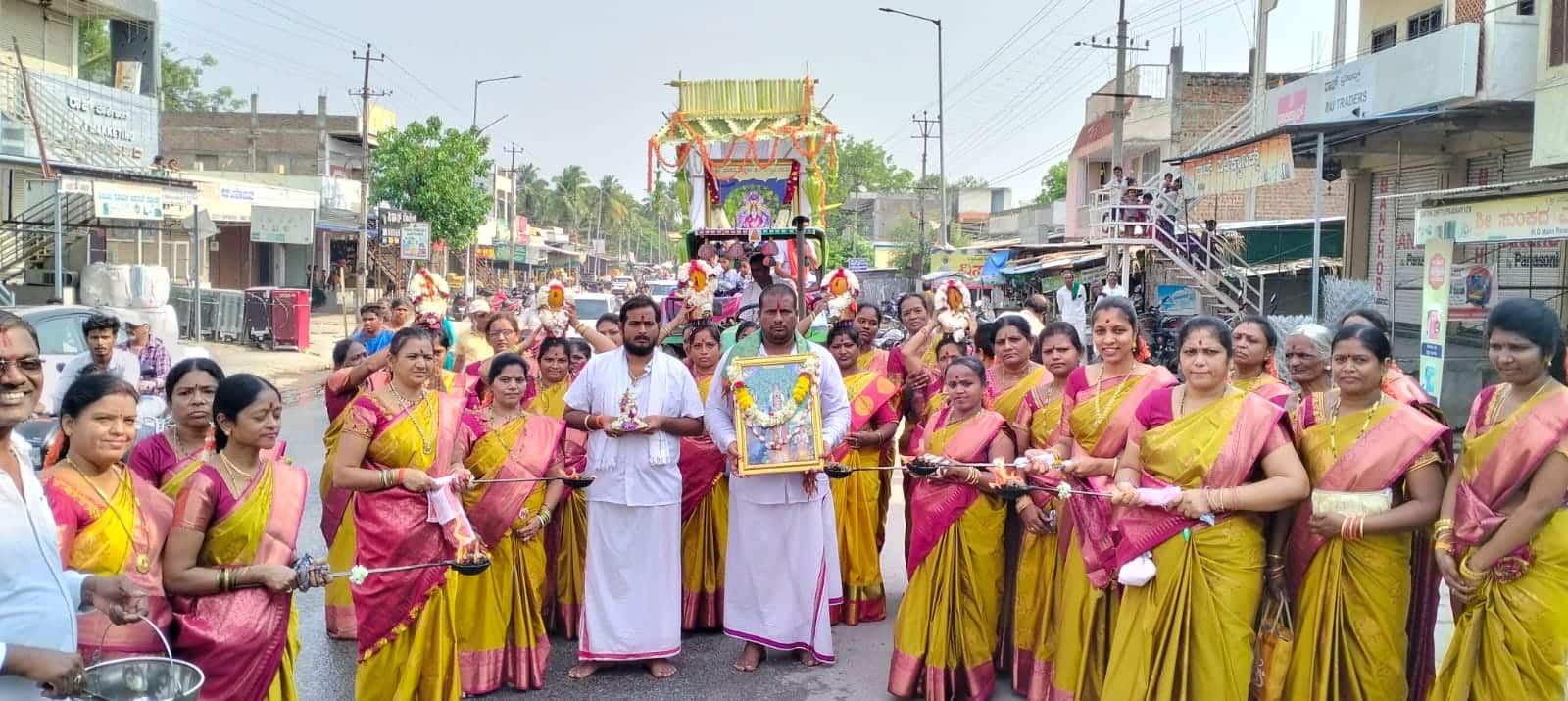 ಪಟ್ಟಣದ ಐತಿಹಾಸಿಕ ಶ್ರೀಲಕ್ಷ್ಮಿ ವೆಂಕಟೇಶ್ವರ ದೇವಸ್ಥಾನದಲ್ಲಿ ಭಾನುವಾರ ಪೂಜೆ ಸಲ್ಲಿಸಿ ವಿವಿಧ ವಾದ್ಯಮೇಳ ಹಾಗೂ ಮಹಿಳೆಯರ ಪೂರ್ಣ ಕುಂಭ ಕಳಸದೊಂದಿಗೆ ಶ್ರೀ ವಾಸವಿ ಕನಿಕಾ ಪರಮೇಶ್ವರಿ ದೇವಿಯ ಭವ್ಯ ಮೆರವಣಿಗೆ ಪ್ರಾರಂಭವಾಯಿತು. ಮೆರವಣಿಗೆ ರಾಜ್ಯ ಹೆದ್ದಾರಿಯ ಮೂಲಕ ಸಾಗಿ ನವಲಿ ವೃತ್ತದ ಮೂಲಕ ನವಲಿ ರಸ್ತೆಯಲ್ಲಿ ಸಾಗಿ ವಾಸವಿನಗರದ ಕನ್ನಿಕಾಪರಮೇಶ್ವರಿ ದೇವಸ್ಥಾನಕ್ಕೆ ಬಂದು ತಲುಪಿತು.