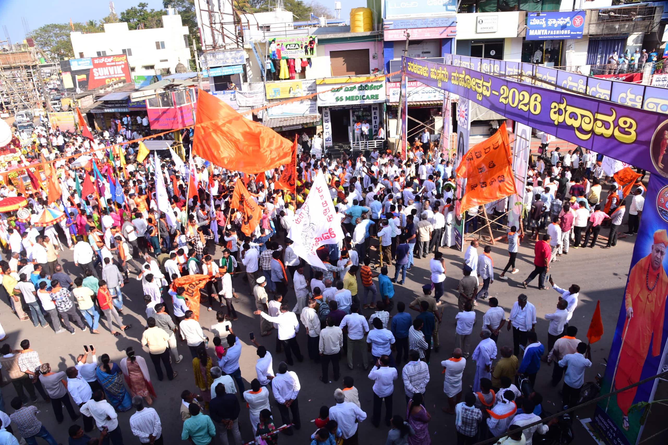 ಶ್ರೀಮಠದ ವಿದ್ಯಾರ್ಥಿಗಳು ಶಿವಧ್ವಜ ಹಿಡಿದು, ಮಹಿಳೆಯರು ಬಣ್ಣದ ಸೀರೆಯನ್ನುಟ್ಟು ಕುಂಭ ಕಳಸಗಳನ್ನು ಹೊತ್ತು ಸಹಸ್ರಾರು ಭಕ್ತರು ಡೊಳ್ಳುಕುಣಿತ ಇತರ ಕಲಾತಂಡಗಳೊಂದಿಗೆ ಸಾಗಿದರು.ತೆರೆದ ವಾಹನ, ಬೆಳ್ಳಿ ಪಲ್ಲಕ್ಕಿಯನ್ನು ಬೃಹತ್ ಹೂವಿನ ಹಾರಗಳಿಂದ ಸಿಂಗರಿಸಲಾಗಿತ್ತು. ಶ್ರೀಗಳು ಶ್ರೀ ಮಠದ ಹಿರಿಯ ಶ್ರೀಗಳ ಪುತ್ಥಳಿಗೆ ಪುಷ್ಪ ನಮಿಸಿ ನಂತರ ಬೆಳ್ಳಿ ಪಲ್ಲಕ್ಕಿಯಲ್ಲಿ ಆಸೀನರಾದರು. ಗ್ರಾಮದ ಪ್ರತಿ ಬೀದಿಗಳ ಗ್ರಾಮಸ್ಥರು ತಳಿರು ತೋರ, ಮಹಿಳೆಯರು ರಂಗೋಲಿ ಹಾಕಿದರು. ದಾವಣಗೆರೆಯ ಶಿವಸೈನ್ಯದ ಯುವಕರು ಶಿವ ಬಾವುಟದ ಜತೆಗೆ ಕುಣಿದು ಕುಪ್ಪಳಿಸಿದರು.