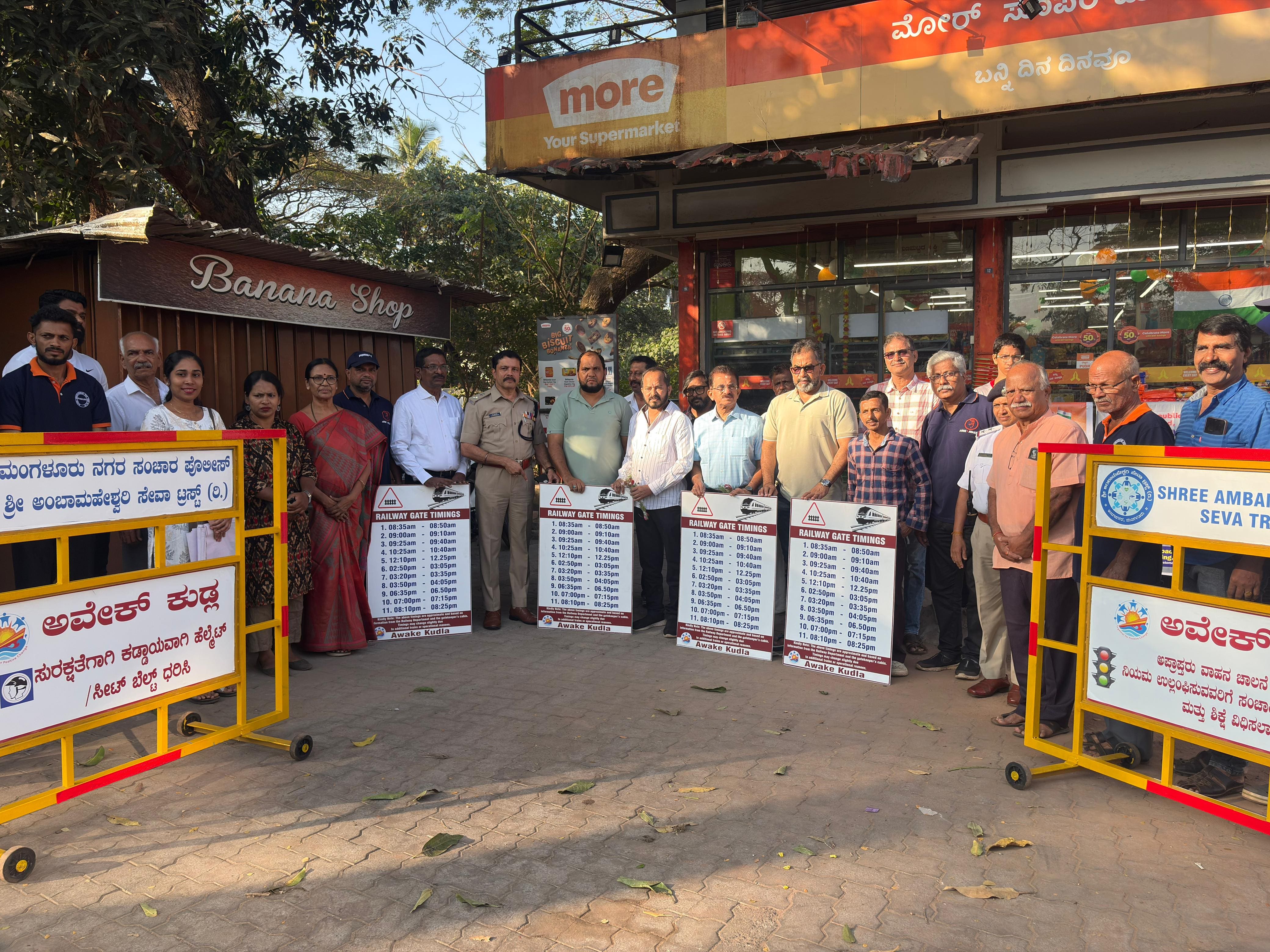 ಮಂಗಳೂರು: ಶ್ರೀ ಅಂಬಾಮಹೇಶ್ವರಿ ಸೇವಾ ಟ್ರಸ್ಟ್ (ರಿ.) ವತಿಯಿಂದ ಅವೇಕ್ ಕುಡ್ಲ ಪರಿಕಲ್ಪನೆಯಡಿ ಮಂಗಳೂರು ನಗರ ಸಂಚಾರ ಪೊಲೀಸ್ ಇಲಾಖೆ ಸಹಯೋಗದಲ್ಲಿ ಸಂಚಾರ ಸುರಕ್ಷತೆ ಮತ್ತು ಸಾರ್ವಜನಿಕ ಜಾಗೃತಿ ಕಾರ್ಯಕ್ರಮವನ್ನು ಪಾಂಡೇಶ್ವರ ಮತ್ತು ಹೊಯ್ಗೆ ಬಜಾರ್ ರೈಲ್ವೆ ಕ್ರಾಸಿಂಗ್ಗಳಲ್ಲಿ ಭಾನುವಾರ ಆಯೋಜಿಸಲಾಯಿತು. ಸಂಚಾರ ಡಿಸಿಪಿ ರವಿಶಂಕರ್ ಇವರು ಟ್ರಾಫಿಕ್ ಬ್ಯಾರಿಕೇಡ್ಸ್ ಹಾಗೂ ರೈಲ್ವೆ ಗೇಟ್ ವೇಳಾಪಟ್ಟಿ ಫಲಕಗಳನ್ನು ಅನಾವರಣ ಮಾಡುವ ಮೂಲಕ ಅಧಿಕೃತ ಚಾಲನೆ ನೀಡಿದರು.