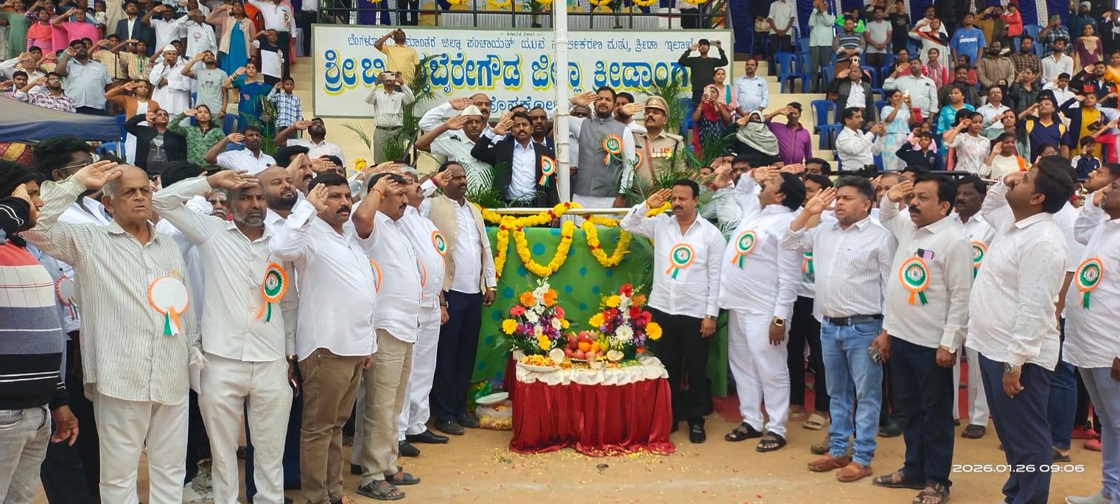 ಹೊಸಕೋಟೆಯಲ್ಲಿ 77ನೇ ಗಣರಾಜ್ಯೋತ್ಸವ ಕಾರ್ಯಕ್ರಮದಲ್ಲಿ ಶಾಸಕ ಶರತ್ ಬಚ್ಚೇಗೌಡ ಪಥ ಸಂಚಲನದ ಗೌರವ ವಂದನೆ ಸ್ವೀಕರಿಸಿದರು.