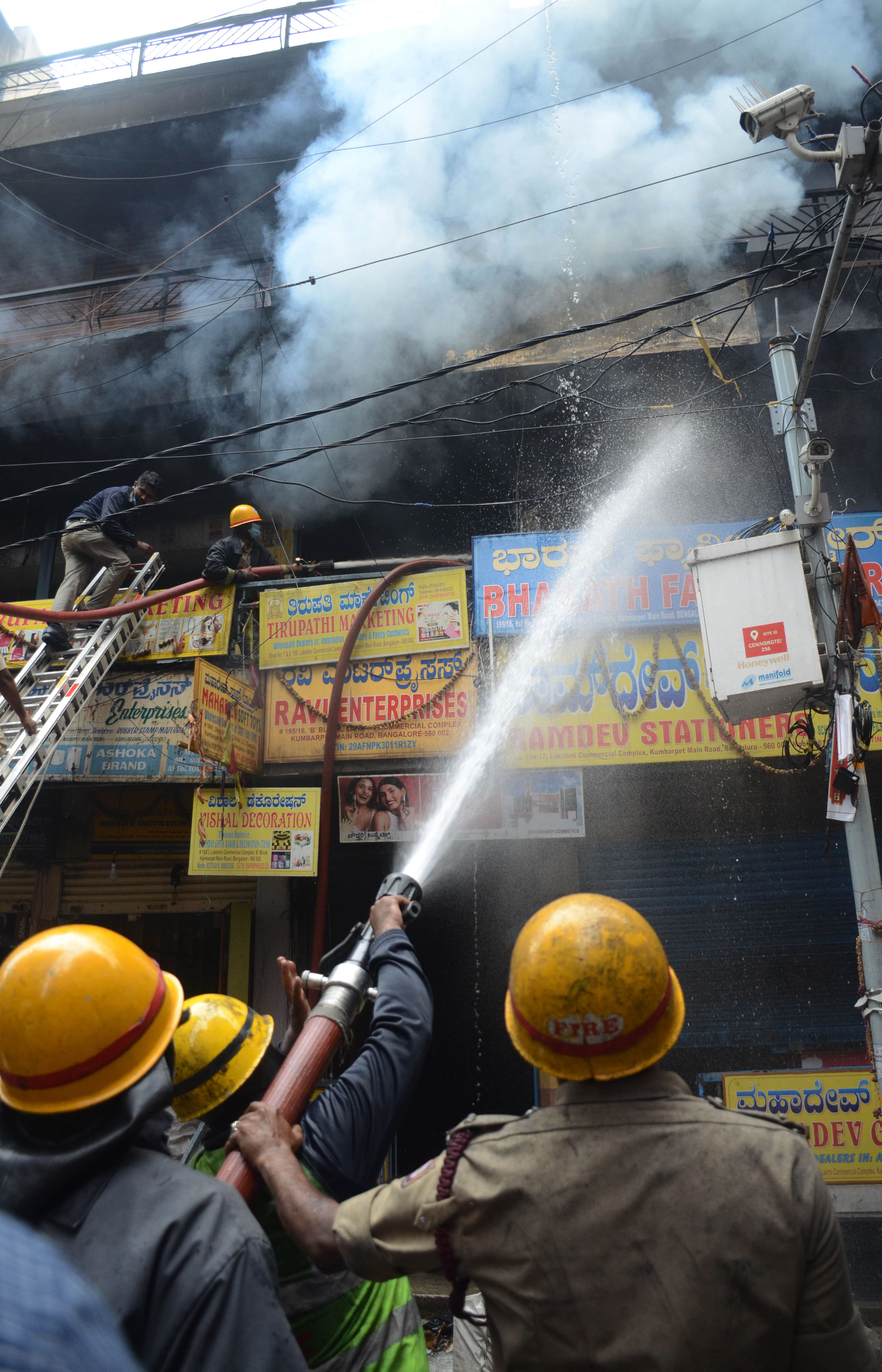 ಸತತ 8 ಗಂಟೆಗಳ ಕಾರ್ಯಾಚರಣೆಬೆಂಕಿ ಕಾಣಿಸಿಕೊಂಡ ಒಂದು ಗಂಟೆಯ ನಂತರ ಬೆಳಿಗ್ಗೆ 8.40 ರ ಸುಮಾರಿಗೆ ಅಗ್ನಿಶಾಮಕ ನಿಯಂತ್ರಣ ಕೊಠಡಿಗೆ ಕರೆ ಬಂದಿತು. ಚಾಮರಾಜಪೇಟೆ ಅಗ್ನಿಶಾಮಕ ಠಾಣೆಯ ಅಗ್ನಿಶಾಮಕ ದಳದವರು ಸ್ಥಳಕ್ಕೆ ಧಾವಿಸಿ ಬೆಂಕಿಯನ್ನು ನಂದಿಸಿದರು. ಸುಮಾರು ಎಂಟು ಗಂಟೆಗಳಿಗೂ ಹೆಚ್ಚಿನ ಕಾರ್ಯಾಚರಣೆ ನಡೆಸಿ ಬೆಂಕಿ ನಂದಿಸಲಾಯಿತು. ಕಿರಿದಾದ ರಸ್ತೆಗಳು ಮತ್ತು ಒಂದಕ್ಕೊಂದು ಅಂಟಿಕೊಂಡಿರುವಂತೆ ನಿರ್ಮಿಸಿರುವ ಕಟ್ಟಡಗಳು ಅಗ್ನಿಶಾಮಕ ದಳದವರು ಸ್ಥಳಕ್ಕೆ ಪ್ರವೇಶಿಸಲು ಅತ್ಯಂತ ಕಷ್ಟಕರವಾಯಿತು. ಈ ಪ್ರದೇಶದಲ್ಲಿ ಇತ್ತೀಚೆಗೆ ವರದಿಯಾದ ಮೂರನೇ ಅಗ್ನಿ ಅವಘಡ ಪ್ರಕರಣ ಇದಾಗಿದೆ ಎಂದು ಅಧಿಕಾರಿಗಳು ತಿಳಿಸಿದ್ದಾರೆ.