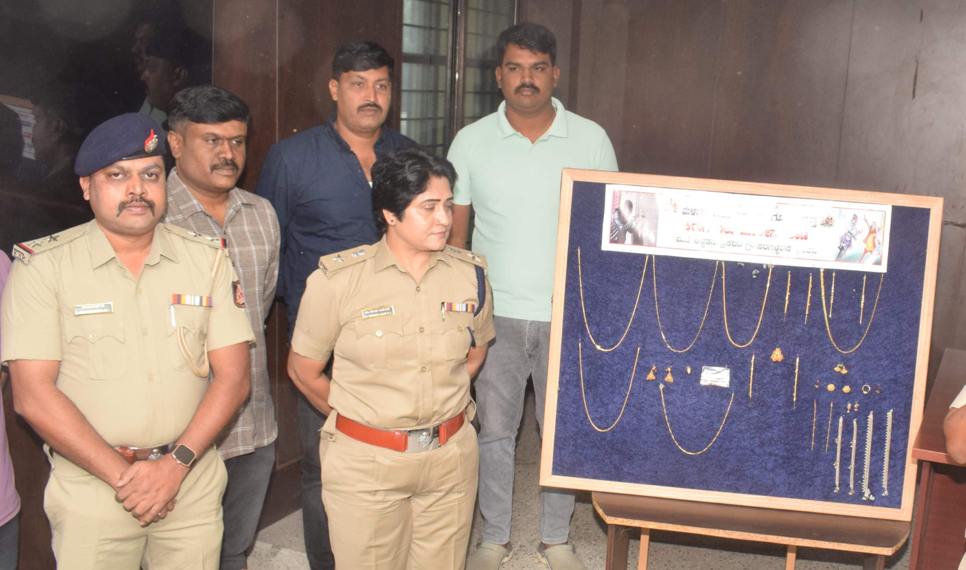 ಮೈಸೂರು ಮೂಲದ ಇಬ್ಬರು ಸರಗಳ್ಳರನ್ನು ಬಂಧಿಸಿರುವ ಮಳವಳ್ಳಿ ತಾಲೂಕಿನ ಕಿರುಗಾವಲು ಠಾಣೆ ಪೊಲೀಸರು ೨೫೩ ಗ್ರಾಂ ಚಿನ್ನ, ೧೭ ಗ್ರಾಂ ಬೆಳ್ಳಿ ಆಭರಣ ವಶಪಡಿಸಿಕೊಂಡಿದ್ದಾರೆ. ಕೃತ್ಯಕ್ಕೆ ಬಳಸುತ್ತಿದ್ದ ಒಂದು ಪಲ್ಸರ್ ಬೈಕ್ ಮತ್ತು ಆಕ್ಸಿಸ್ ಬೈಕ್ನ್ನೂ ವಶಕ್ಕೆ ತೆಗೆದುಕೊಂಡಿರುವ ಪೊಲೀಸರು ೩೧.೯೮ ಲಕ್ಷ ರು. ಮೌಲ್ಯದ ಮಾಲನ್ನು ಜಪ್ತಿ ಮಾಡಿದ್ದಾರೆ ಎಂದು ಜಿಲ್ಲಾ ಪೊಲೀಸ್ ವರಿಷ್ಠಾಧಿಕಾರಿ ಡಾ.ವಿ.ಜೆ.ಶೋಭಾರಾಣಿ ಹೇಳಿದರು.ಮೈಸೂರಿನ ಶಾಂತಿನಗರ ಒಂದನೇ ಕ್ರಾಸ್ ನಿವಾಸಿ ಸದ್ದಾಂ ಹುಸೇನ್ ಅಲಿಯಾಸ್ ಸದ್ದಾಂ (೩೨) ಹಾಗೂ ರಾಜೀವ್ ನಗರದ ಹಲ್ಬಾಲ್ ಮಸೀದಿ ಸಮೀಪ ನಿವಾಸಿ ಸೈಯದ್ ಅಯೂಬ್ (೩೨) ಬಂಧಿತ ಆರೋಪಿಗಳು. ಸದ್ದಾಂ ಹುಸೇನ್ ಮೈಸೂರಿನಲ್ಲಿ ಹಲ್ಲೆ ಪ್ರಕರಣ ದಾಖಲಾಗಿದ್ದರೆ, ಸೈಯದ್ ಅಯೂಬ್ ವಿರುದ್ಧ ಶಿವಮೊಗ್ಗ, ಮೈಸೂರು, ಮಂಡ್ಯ, ಚಾಮರಾಜನಗರ ಜಿಲ್ಲೆಗಳ ವ್ಯಾಪ್ತಿಯಲ್ಲಿ ೩೮ ಪ್ರಕರಣಗಳು ದಾಖಲಾಗಿರುವುದಾಗಿ ತಿಳಿದುಬಂದಿದೆ.