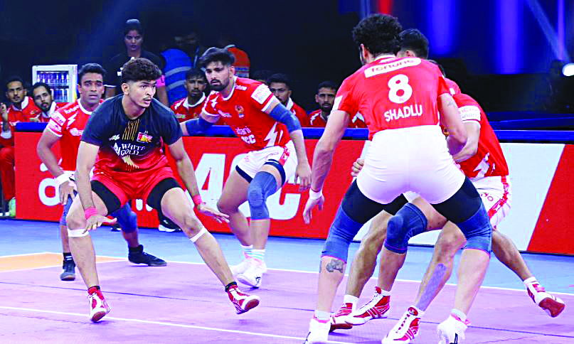ಜೈಪುರ: ರಕ್ಷ ಣಾತ್ಮಕ ಆಟಕ್ಕೆ ಸಾಕ್ಷಿಯಾದ ಬೆಂಗಳೂರು ಬುಲ್ಸ್ ಮತ್ತು ಗುಜರಾತ್ ಜೈಂಟ್ಸ್ ನಡುವಿನ ಹೈವೋಲ್ಟೇಜ್ ಹಣಾಹಣಿಯಲ್ಲಿ ಮಾಜಿ ಚಾಂಪಿಯನ್ ಬುಲ್ಸ್ ತಂಡ 28-24 ಅಂಕಗಳಿಂದ ಜಯಭೇರಿ ಬಾರಿಸಿತು. ಆ ಮೂಲಕ ಈ ಆವೃತ್ತಿಯಲ್ಲಿ 5ನೇ ಗೆಲುವು ದಾಖಲಿಸಿ ಅಂಕಪಟ್ಟಿಯಲ್ಲಿ 4ನೇ ಸ್ಥಾನಕ್ಕೆ ಜಿಗಿಯಿತು.