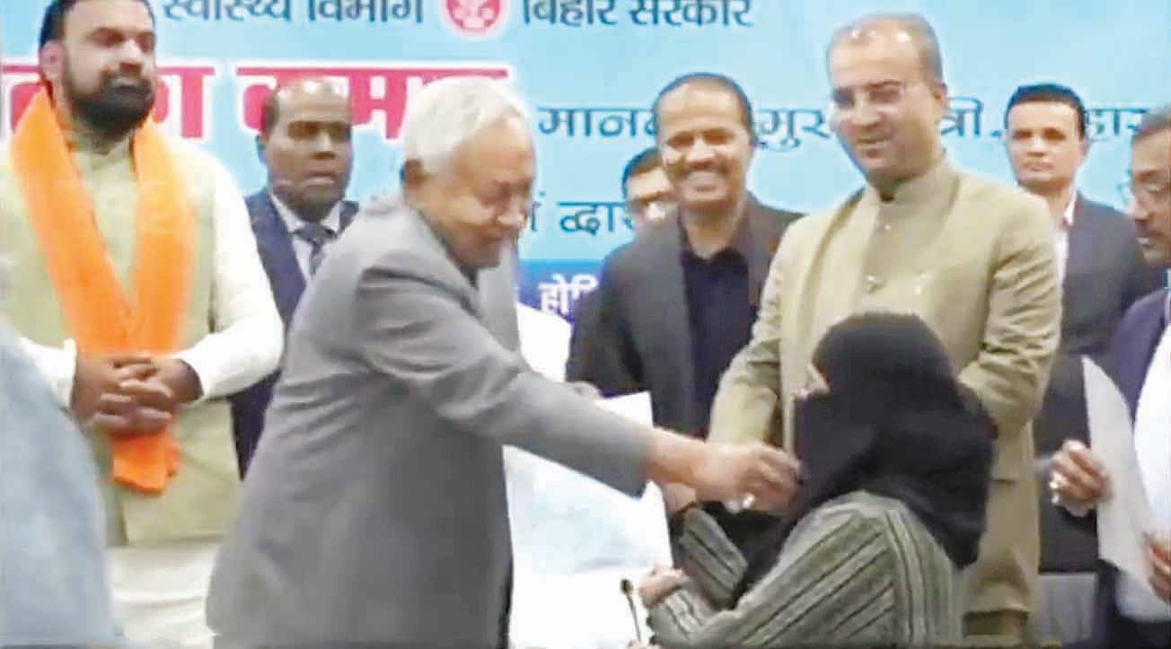 ನೇಮಕಾತಿ ಪತ್ರ ವಿತರಣೆ ಕಾರ್ಯಕ್ರಮದಲ್ಲಿ ಸಿಎಂ ನಿತೀಶ್ ಕುಮಾರ್ ಅವರು ವೈದ್ಯೆಯೊಬ್ಬರ ಹಿಜಾಬ್ ಎಳೆದಿರುವ ಘಟನೆ ನಡೆದಿದೆ. ವಿಪಕ್ಷಗಳಾದ ಆರ್ಜೆಡಿ ಮತ್ತು ಕಾಂಗ್ರೆಸ್ ಇದರ ವಿಡಿಯೋವನ್ನು ಹಂಚಿಕೊಂಡಿದ್ದು, ನಿತೀಶ್ರ ಮಾನಸಿಕ ಸ್ಥಿರತೆಯನ್ನು ಪ್ರಶ್ನಿಸಿವೆ. ಜನರಿಂದ ಭಾರೀ ಆಕ್ರೋಶ ವ್ಯಕ್ತವಾಗುತ್ತಿದೆ.