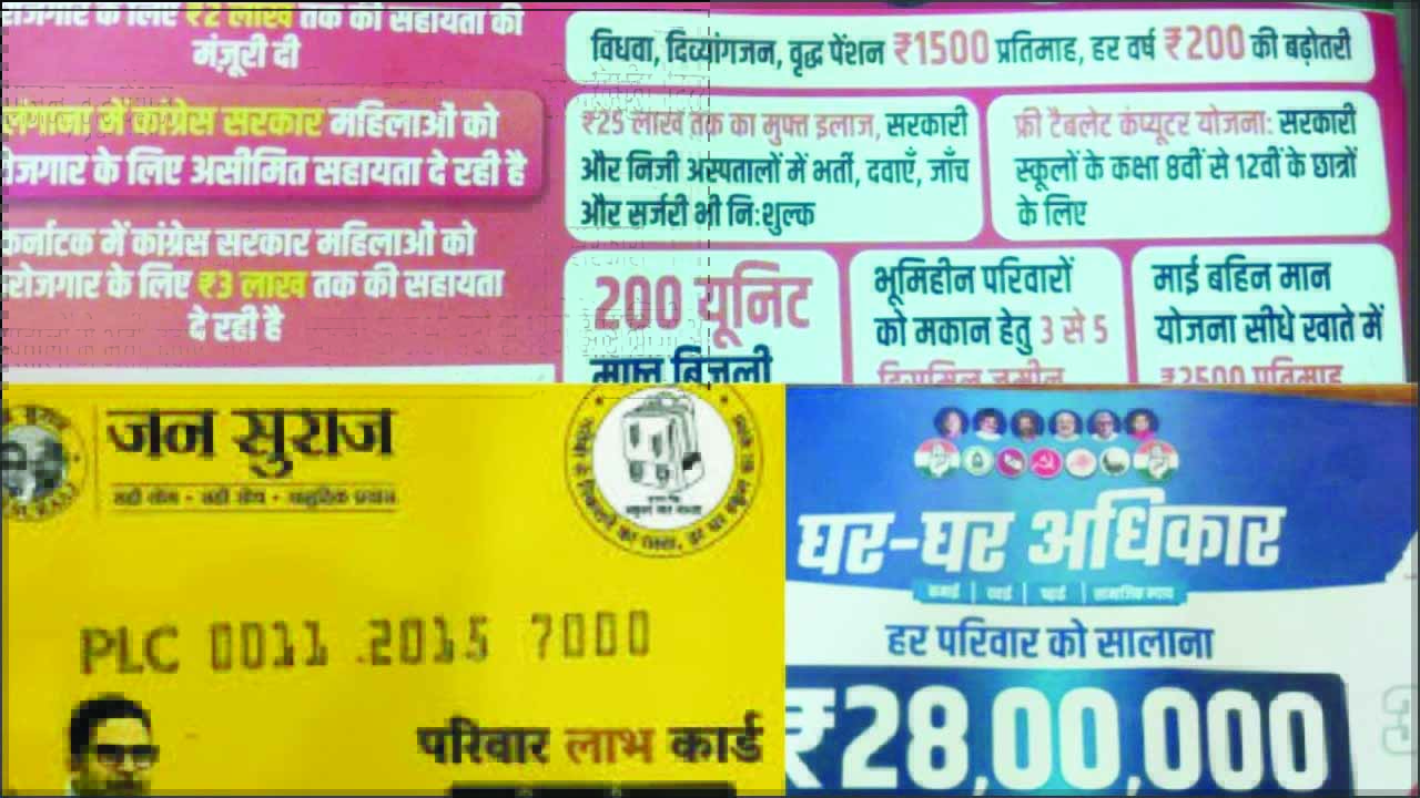 ಜನ ಸುರಾಜ್ ಪಕ್ಷದ ನೇತಾರ ಪ್ರಶಾಂತ್ ಕಿಶೋರ್ ಎಟಿಎಂ ಕಾರ್ಡ್ ಹೋಲುವ ‘ಪರಿವಾರ ಲಾಭ ಕಾರ್ಡ್’ ಅನ್ನು ಬಿಡುಗಡೆ ಮಾಡಿದ್ದಾರೆ. ಯುವಕರಿಗೆ ಉದ್ಯೋಗ, ವೃದ್ಧರು, ವಿಧವೆಯರು ಮತ್ತು ಅಂಗವಿಕಲರಿಗೆ ಪಿಂಚಣಿ, ಮಹಿಳೆಯರಿಗೆ ಕಡಿಮೆ ಬಡ್ಡಿದರದಲ್ಲಿ ಸಾಲ, 15ನೇ ವಯಸ್ಸಿನವರೆಗೆ ಉಚಿತ ಶಿಕ್ಷಣ, ರೈತರಿಗೆ ಸಹಾಯಧನ ಮುಂತಾದ ಭರವಸೆಗಳನ್ನು ಈ ಕಾರ್ಡ್ನಲ್ಲಿ ವಿವರಿಸಲಾಗಿದೆ.
