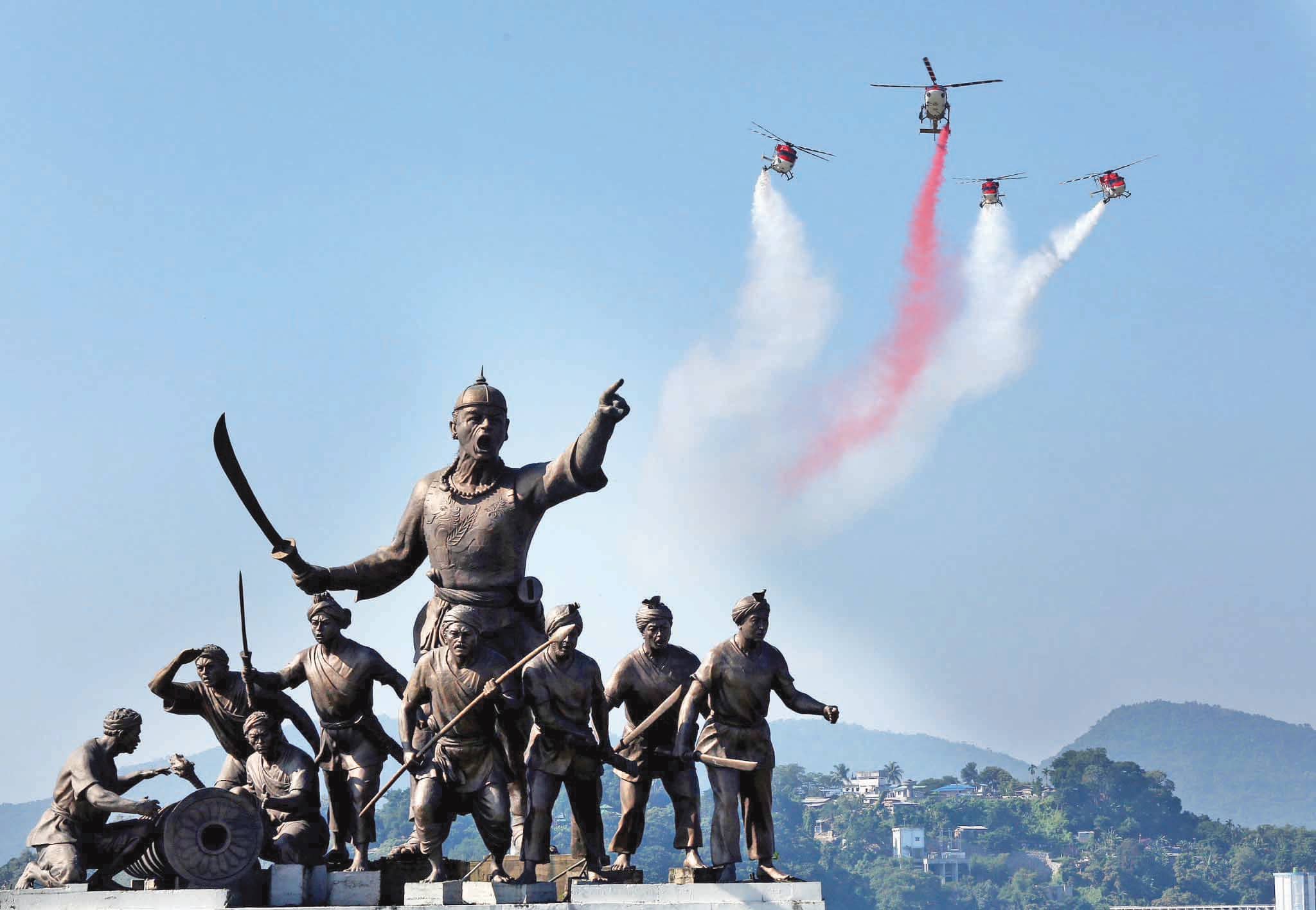 ಗುವಾಹಟಿ: ಪಾಕಿಸ್ತಾನ ವಿರುದ್ಧದ ಆಪರೇಷನ್ ಸಿಂದೂರ ಕಾರ್ಯಾಚರಣೆಯಲ್ಲಿ ಭಾರೀ ಶೌರ್ಯ ತೋರಿದ ಯೋಧರಿಗೆ ಗೌರವ ಸಮರ್ಪಿಸುವ ನಿಟ್ಟಿನಲ್ಲಿ ಭಾರತೀಯ ವಾಯಪಡೆಯ ಕಾಪ್ಟರ್ಗಳು ಭಾನುವಾರ ಇಲ್ಲಿನ ಆಗಸದಲ್ಲೇ ಸಿಂದೂರ ವರ್ಣವನ್ನು ಬಿಡಿಸುವ ಮೂಲಕ ಗೌರವ ಸೂಚಿಸಿದೆ. ಶನಿವಾರ ಗುವಾಹಟಿಯಲ್ಲಿ ನಡೆದ ವಾಯುಪಡೆ ದಿನದ ಅಂತಿಮ ಕಾರ್ಯಕ್ರಮದಲ್ಲಿ ವಾಯುಪಡೆಯ ಸಾರಂಗ್ ಕಾಪ್ಟರ್ಗಳು ಆಗಸದಲ್ಲಿ ಬಿಳಿ ಮತ್ತು ಕೆಂಪು ಬಣ್ಣವನ್ನು ಸೂಸಿ ಗೌರವ ಸೂಚಿಸಿತು.