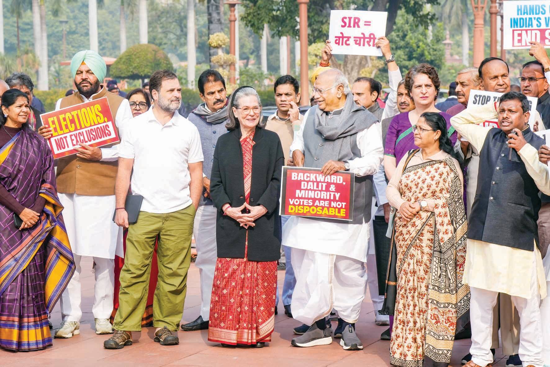 ಕಾಂಗ್ರೆಸ್ ಅಧ್ಯಕ್ಷ ಮಲ್ಲಿಕಾರ್ಜುನ ಖರ್ಗೆ, ಪಕ್ಷದ ಮಾಜಿ ಮುಖ್ಯಸ್ಥರಾದ ಸೋನಿಯಾ ಗಾಂಧಿ ಮತ್ತು ರಾಹುಲ್ ಗಾಂಧಿ ಸೇರಿದಂತೆ ಹಲವಾರು ವಿಪಕ್ಷ ನಾಯಕರು ಮಂಗಳವಾರ ಸಂಸತ್ ಭವನದ ಹೊರಗೆ ಎಸ್ಐಆರ್ ವಿರುದ್ಧ ಪ್ರತಿಭಟನೆ ನಡೆಸಿ ಚುನಾವಣಾ ಸುಧಾರಣೆಗಳ ಕುರಿತು ಚರ್ಚೆಗೆ ಒತ್ತಾಯಿಸಿದರು.==