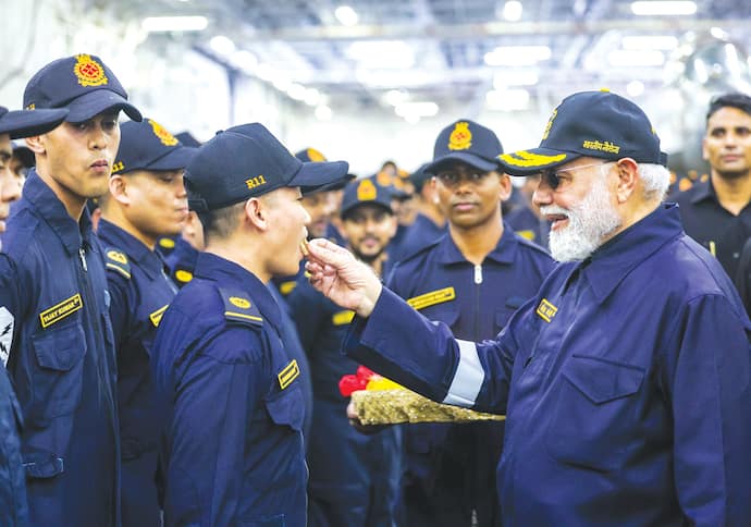 ‘ನೌಕಾಪಡೆಯಿಂದಾಗಿ ಆಪರೇಷನ್ ಸಿಂದೂರದ ವೇಳೆ ಪಾಕ್ಗೆ ನಿದ್ರೆಯಿಲ್ಲದ ರಾತ್ರಿ ಕಳೆಯುವಂತಾಯಿತು. ಮೂರೂ ಸೇನಾಪಡೆಗಳ ಹೋರಾಟದ ಕಾರಣ ಪಾಕ್ ಶರಣಾಗುವಂತಾಯಿತು’ ಎಂದು ಮೋದಿ ಶಹಬ್ಬಾಸ್ಗಿರಿ ನೀಡಿದರು.