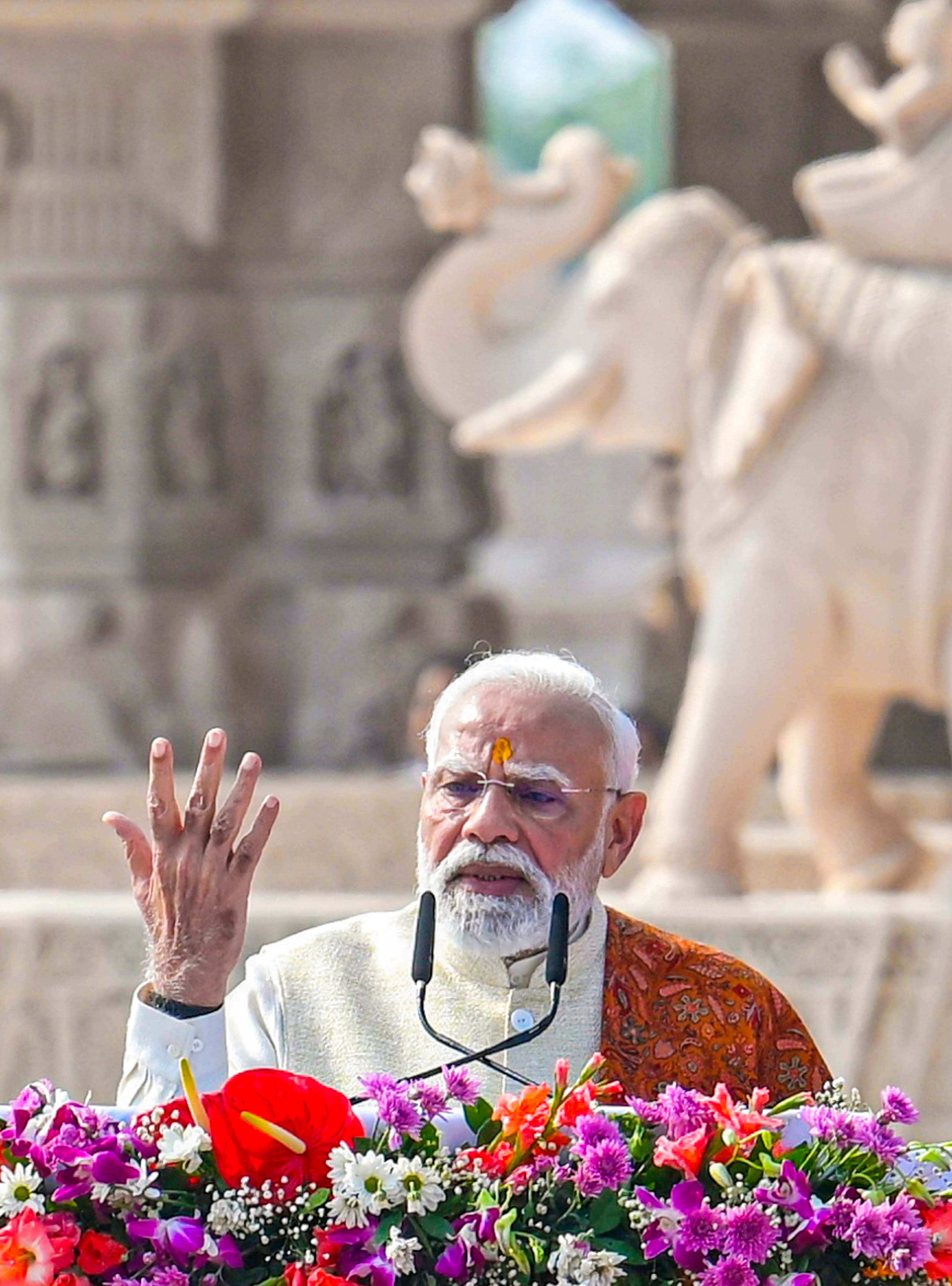 ‘ಇಂದು ಇಡೀ ಭಾರತ-ವಿಶ್ವ ರಾಮಮಯವಾಗಿದೆ. ಪ್ರತಿಯೊಬ್ಬ ರಾಮ ಭಕ್ತನ ಹೃದಯದಲ್ಲೂ ಈಗ ವಿಶೇಷವಾದ ತೃಪ್ತಿಯ, ಕೃತಜ್ಞತೆಯ ಭಾವ ತುಂಬಿಕೊಂಡಿದೆ. ಅಗಾಧವಾದ ಅಲೌಕಿಕ ಆನಂದ ಆವರಿಸಿದೆ. ಶತಮಾನಗಳಷ್ಟು ಹಳೆಯ ಗಾಯಗಳು ವಾಸಿಯಾಗಿವೆ. ಶತಮಾನಗಳಷ್ಟು ಹಳೆಯ ನೋವಿಗೆ ಇಂದು ವಿದಾಯ ಹೇಳಲಾಗಿದೆ. ಶತಮಾನಗಳಷ್ಟು ಹಳೆಯ ಸಮಸ್ಯೆಗೆ ಪರಿಹಾರ ಸಿಕ್ಕಿದೆ. 500 ವರ್ಷಗಳಷ್ಟು ಕಾಲದಿಂದ ಮಾಡಿಕೊಂಡು ಬಂದಿದ್ದ ತ್ಯಾಗದ ಕಿಚ್ಚಿಗೆ ಬೆಲೆ ಸಿಕ್ಕಿದೆ ಎಂದರು.ಇದೇ ವೇಳೆ ದೇಗುಲದ ಮೇಲಿನ ಕೇಸರಿ ಧ್ವಜಾರೋಹಣವನ್ನು ವಿಶೇಷ ಮತ್ತು ದೈವೀ ಕ್ಷಣ ಎಂದು ಕರೆದ ಮೋದಿ, ರಾಮ ಮಂದಿರದ ಮೇಲೆ ಹಾರಾಡುತ್ತಿರುವ ಪವಿತ್ರ ಧ್ವಜವು ಸುಳ್ಳಿನ ಮೇಲೆ ಅಂತಿಮ ಗೆಲುವು ಸತ್ಯದ್ದೇ ಎಂಬುದಕ್ಕೆ ಸಾಕ್ಷಿ ಎಂದರು.