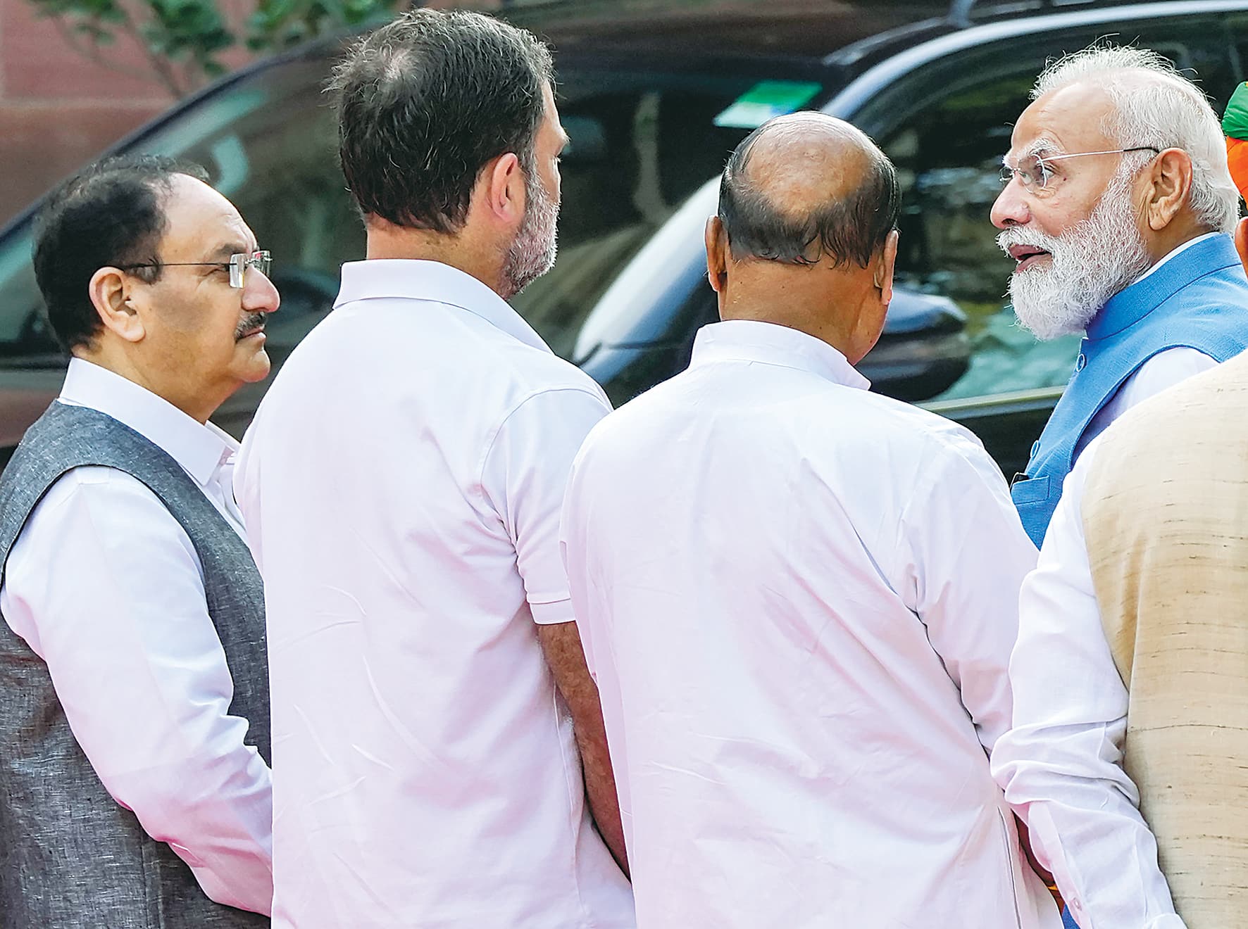 ಸದಾ ಒಬ್ಬರ ಮೇಲೆ ಒಬ್ಬರು ಮಾತಿನ ಬಾಣ ಪ್ರಯೋಗಿಸುತ್ತಾ, ಬದ್ಧವೈರಿಗಳಂತಿರುತ್ತಿದ್ದ ಪ್ರಧಾನಿ ನರೇಂದ್ರ ಮೋದಿ ಮತ್ತು ಲೋಕಸಭಾ ವಿಪಕ್ಷ ನಾಯಕ ರಾಹುಲ್ ಗಾಂಧಿ ಒಂದೇ ಕಡೆ ಮುಖಾಮುಖಿಯಾದರು. ಮುನಿಸು ಮರೆತು ಪರಸ್ಪರ ಆತ್ಮೀಯತೆಯಂತೆ ಮಾತನಾಡುತ್ತಾ ಎಲ್ಲರಿಗೂ ಅಚ್ಚರಿ ಮೂಡಿಸಿದರು.