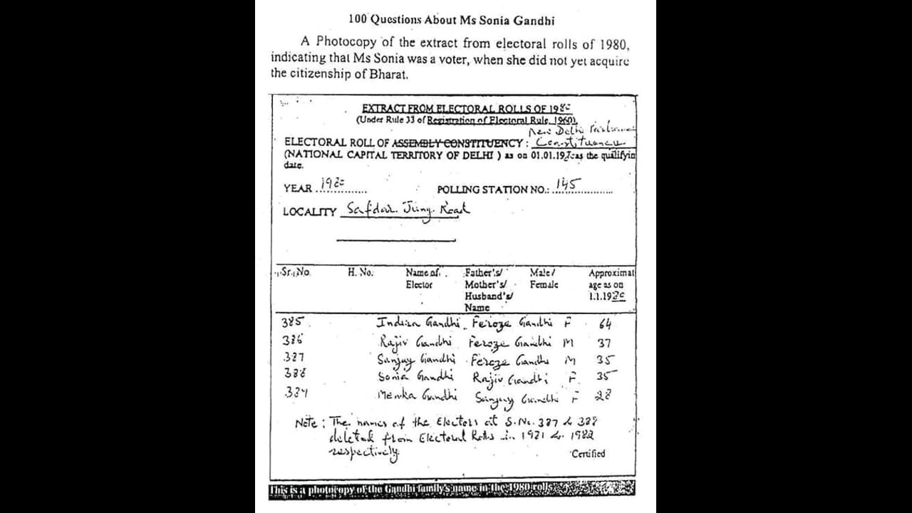 ಈ ಮೂಲಕ ಸೋನಿಯಾ ಗಾಂಧಿ ವಿದೇಶಿ ಪ್ರಜೆಯಾಗಿದ್ದಾಗಲೇ ಅಂದರೆ ಅವರು ಇನ್ನೂ ತಮ್ಮ ತಾಯ್ನಾಡು ಇಟಲಿ ಪೌರತ್ವ ಹೊಂದಿದ್ದಾಗಲೇ ಭಾರತದಲ್ಲಿ ಮತದಾನದ ಹಕ್ಕು ಪಡೆದಿದ್ದರು ಎಂಬುದು ಬಿಜೆಪಿ ಆರೋಪ.