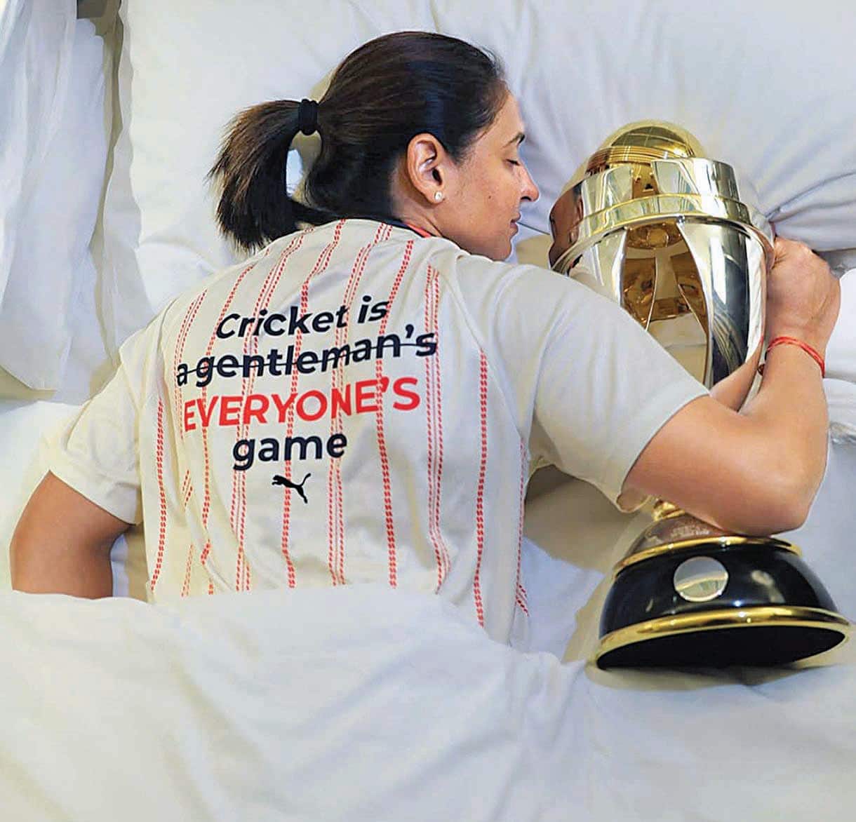ಭಾರತದ ತಂಡದ ನಾಯಕಿ ಹರ್ಮನ್ಪ್ರೀತ್ ಕೌರ್ ಅವರು ವಿಶ್ವಕಪ್ಅನ್ನು ಮಗ್ಗುಲಲ್ಲೇ ಇಟ್ಟುಕೊಂಡು ಭಾನುವಾರ ನಿದ್ರಿಸಿದರು. ‘ಕ್ರಿಕೆಟ್ ಎಂಬುದು ಜೆಂಟಲ್ಮನ್ಗಳಿಗಷ್ಟೇ ಸೀಮಿತವಾದದ್ದಲ್ಲ, ಅದು ಪ್ರತಿಯೊಬ್ಬರ ಆಟ’ ಎಂಬ ಬರಹವುಳ್ಳ ಅವರ ಟೀ-ಶರ್ಟ್ ಭಾರಿ ವೈರಲ್ ಆಗಿದೆ.