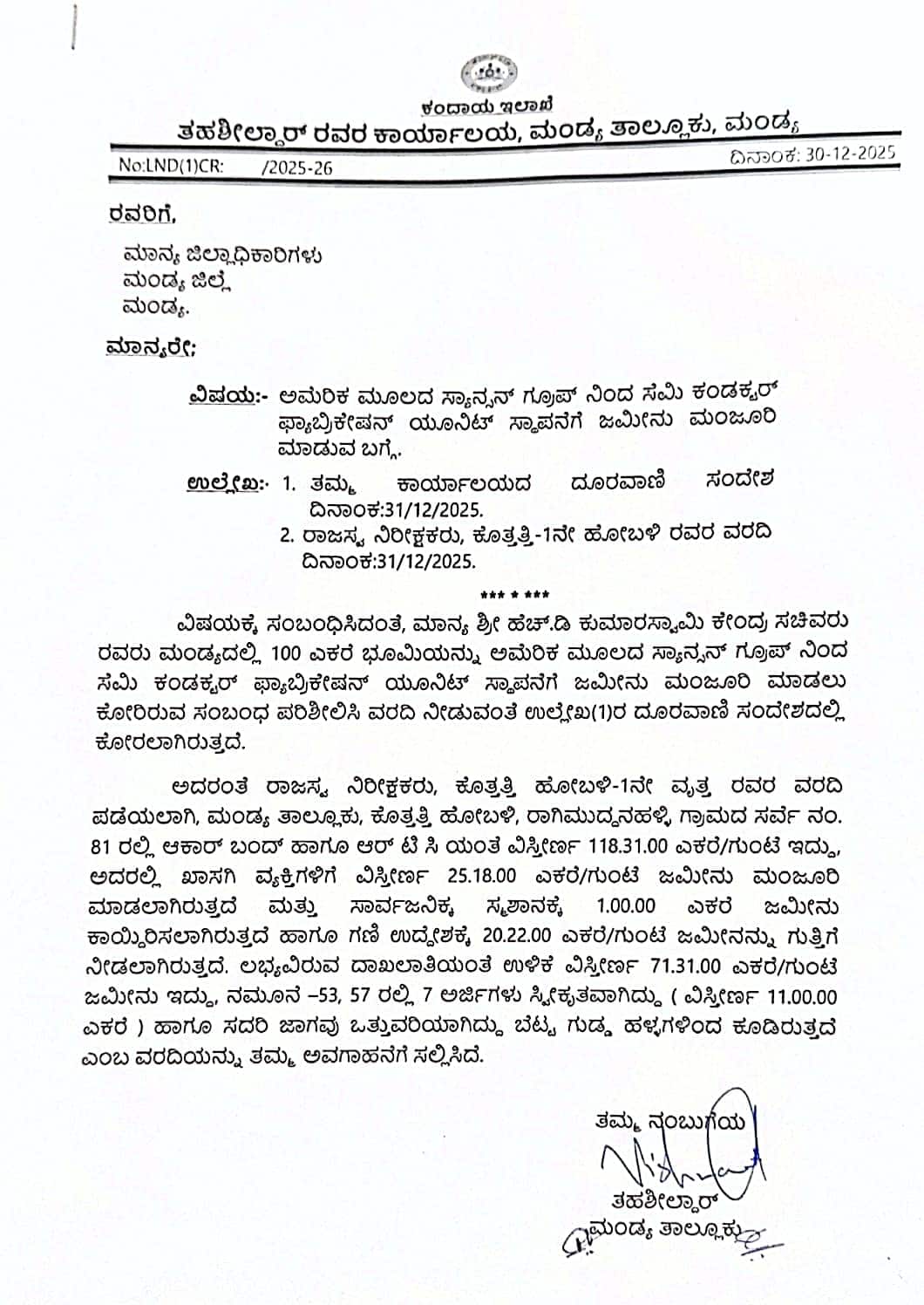 ಅಮೆರಿಕ ಮೂಲದ ಸ್ಯಾನ್ಸನ್ ಗೂಪ್ ಕಂಪನಿ ಸ್ಥಾಪಿಸಲುದ್ದೇಶಿಸಿರುವ ಸೆಮಿ ಕಂಡಕ್ಟರ್ ಫ್ಯಾಬ್ರಿಕೇಷನ್ ಯೂನಿಟ್ ಸ್ಥಾಪನೆಗೆ ಬೆಂಗಳೂರು-ಮೈಸೂರು ಹೆದ್ದಾರಿ ಪಕ್ಕದಲ್ಲೇ ಸರ್ಕಾರಿ ಭೂಮಿ ಲಭ್ಯವಿರುವ ಬಗ್ಗೆ ಮಾಹಿತಿ ಸಂಗ್ರಹಿಸಲಾಗಿದೆ.ಮಂಡ್ಯ ತಾಲೂಕು ಕೊತ್ತತ್ತಿ ಹೋಬಳಿ ರಾಗಿಮುದ್ದನಹಳ್ಳಿ ಗ್ರಾಮದ ಸರ್ವೇ ನಂ.೮೧ರಲ್ಲಿ ೭೨.೩೧ ಎಕರೆ ಹಾಗೂ ಶ್ರೀರಂಗಪಟ್ಟಣ ತಾಲೂಕು ಸಿದ್ದಾಪುರ ಗ್ರಾಮದ ಸರ್ವೇ ನಂ. ೯೩ರಲ್ಲಿ ೨೧.೨೨ ಎಕರೆ ಹುಲ್ಲುಬನ್ನಿ ಜಾಗ ಸೇರಿದಂತೆ ೯೪.೧೩ ಎಕರೆ ಜಾಗವನ್ನು ಗುರುತಿಸಿ ಎರಡೂ ತಾಲೂಕಿನ ತಹಸೀಲ್ದಾರ್ಗಳು ಜಿಲ್ಲಾಧಿಕಾರಿ ಡಾ.ಕುಮಾರ ಅವರಿಗೆ ಮಾಹಿತಿ ರವಾನಿಸಿದ್ದಾರೆ.