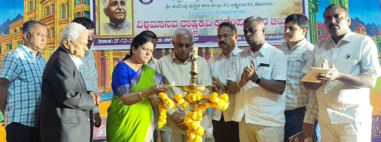 ಕುವೆಂಪು ಕವಿತೆ, ನಾಟಕಗಳನ್ನು ಕನ್ನಡ ಸಾಹಿತ್ಯಕ್ಕೆ ಕೊಡುಗೆಯಾಗಿ ನೀಡಿದ್ದಾರೆ. ಅವರ ತಮ್ಮ ಸಾಹಿತ್ಯ ಕೃಷಿಯಲ್ಲಿ ಸರ್ವ ಜನಾಂಗದವರು, ಒಂದೇ ಎಂಬಂತೆ ಜೀವಿಸಬೇಕು ಎಂಬ ಆಸೆಯ ಹೊಂದಿದ್ದರು ಎನ್ನುವದಕ್ಕೆ ಓ ನನ್ನ ಚೇತನ, ಹಾಗೂ ನೀ ಅನಿಕೇತನ ಕವಿತೆ ಸಾಕ್ಷಿ ಎಂದರು.ಕನ್ನಡಕ್ಕೆ ಕಿರೀಟ ಇದ್ದಂತೆಕುವೆಂಪು ಕನ್ನಡಕ್ಕೆ ಕಿರೀಟ ಇದ್ದಂತೆ. ಅವರು ರಚಿಸಿದ ಹಲವಾರು ಕೃತಿಗಳು ಇಂದು ಆದರ್ಶ ಮೌಲ್ಯಗಳನ್ನು ಹೊಂದಿವೆ. ಅವರು ಸಾಹಿತ್ಯ ಕ್ಷೇತ್ರದಲ್ಲಿ ಯಾರು ಮಾಡದಂತ ಸಾಧನೆ ಮಾಡಿದ್ದಾರೆ. ಅವರ ಆದರ್ಶಗಳನ್ನು ಎಲ್ಲರೂ ಅವಳವಡಿಸಿಕೊಳ್ಳಬೇಕು ಎಂದು ತಿಳಿಸಿದರು.ಮುಜರಾಯಿ ತಹಸೀಲ್ದಾರ್ ಶ್ರೀನಿವಾಸರೆಡ್ಡಿ, ಒಕ್ಕಲಿಗರ ಸಂಘದ ಗೌರವಾಧ್ಯಕ್ಷ ಬೀಸಪ್ಪಗೌಡ, ಜಿಲ್ಲಾಧ್ಯಕ್ಷ ಕೆ.ವಿ.ಶಂಕರಪ್ಪ, ನಿರ್ದೇಶಕ ಡಿ.ಕೆ.ರಮೇಶ್, ಮುಖಂಡರಾದ ನಾರಾಯಣಸ್ವಾಮಿ, ರಮೇಶ್, ಲೋಕೇಶ್, ಕೃ?ಗೌಡ, ಹನೀಫ್, ವರಲಕ್ಷ್ಮಿ ಕುವೆಂಪು ಕುರಿತು ಉಪನ್ಯಾಸ ನೀಡಿದರು. ಟಿ.ವಿ.ರಾಮಸ್ವಾಮಿ ನಿರ್ದೇಶನದಲ್ಲಿ ಶ್ರೀಕೃಷ್ಣ ಸಂಧಾನ ನಾಟಕ ಪ್ರದರ್ಶನ ನಡೆಯಿತು.