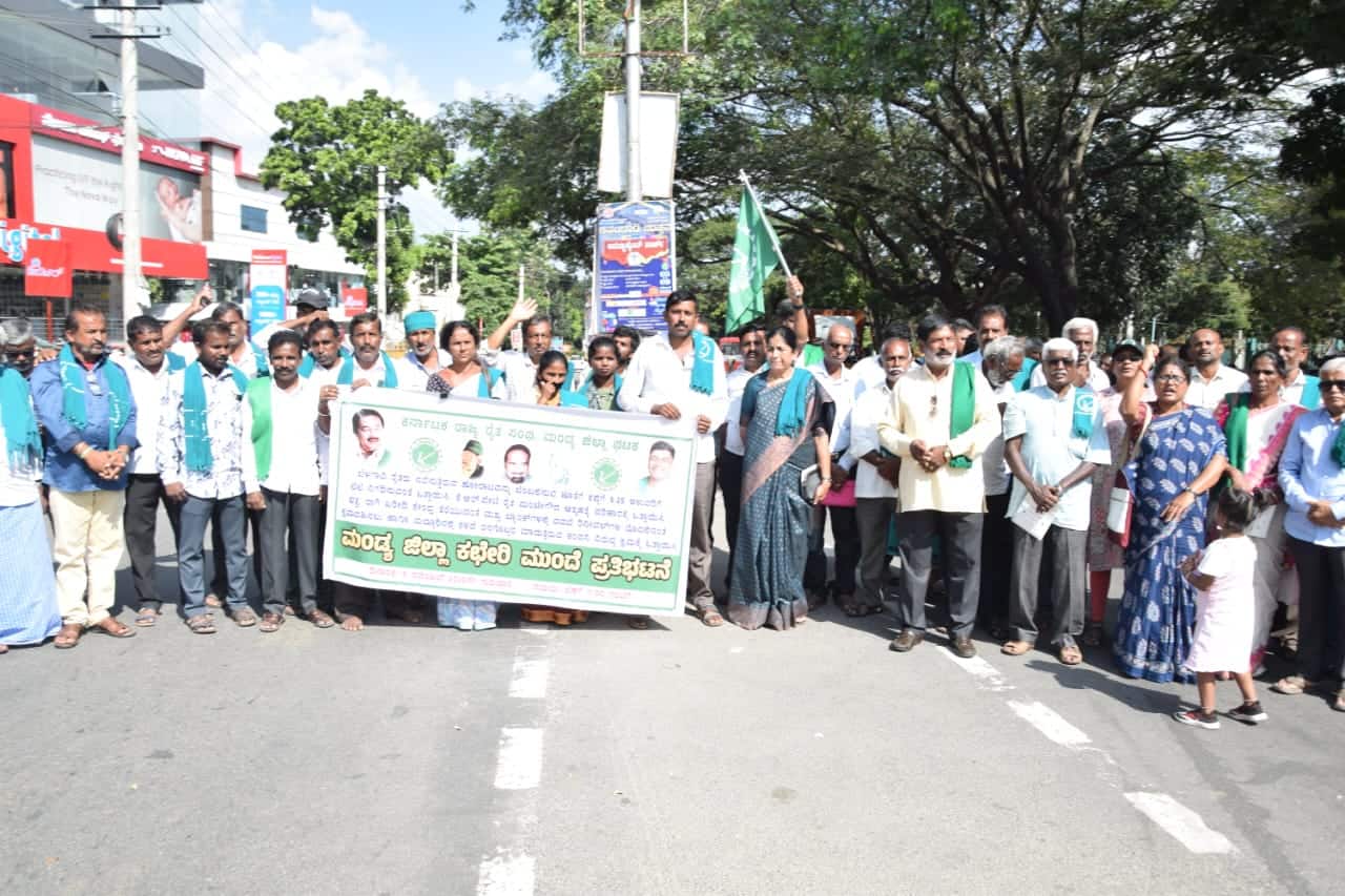 ನಗರದ ಸರ್ ಎಂ.ವಿಶ್ವೇಶ್ವರಯ್ಯ ಪ್ರತಿಮೆ ಎದುರು ಸೇರಿದ ರೈತಸಂಘದ ಕಾರ್ಯಕರ್ತರು, ಬೆಂಗಳೂರು-ಮೈಸೂರು ಹೆದ್ದಾರಿಯಲ್ಲಿ ರಸ್ತೆ ತಡೆ ನಡೆಸಿ ಸರ್ಕಾರಗಳ ವಿರುದ್ಧ ಘೋಷಣೆ ಕೂಗಿ ಆಕ್ರೋಶ ವ್ಯಕ್ತಪಡಿಸಿದರು. ನಂತರ ಜಿಲ್ಲಾಧಿಕಾರಿ ಕಚೇರಿವರೆಗೆ ಮೆರವಣಿಗೆಯಲ್ಲಿ ತೆರಳಿ ಧರಣಿ ನಡೆಸಿದರು.ಉತ್ತರ ಕರ್ನಾಟಕದ ಕಬ್ಬು ಬೆಳೆಗಾರರ ಬೇಡಿಕೆಯಂತೆ ಪ್ರತಿ ಟನ್ ಕಬ್ಬಿಗೆ ೩,೫೦೦ ರು. ನಿಗದಿಪಡಿಸಬೇಕು. ಅದೇ ರೀತಿ ದಕ್ಷಿಣ ಕರ್ನಾಟಕ ಕಬ್ಬು ಬೆಳೆಗಾರರಿಗೆ ಟನ್ ಕಬ್ಬಿಗೆ ೫ ಸಾವಿರ ರು. ನಿಗದಿಮಾಡಬೇಕು. ಕಾಯಂ ಆಗಿ ಭತ್ತ ಮತ್ತು ರಾಗಿ ಖರೀದಿ ಕೇಂದ್ರವನ್ನು ವರ್ಷ ಪೂರ್ತಿ ತೆರೆಯಬೇಕು. ಪಂಜಾಬ್ ಮಾದರಿಯಲ್ಲಿ ನಮ್ಮ ರಾಜ್ಯದಲ್ಲಿಯೂ ರೈತರ ಎಲ್ಲ ಭತ್ತವನ್ನು ಖರೀದಿಸಬೇಕು. ಈಗಾಗಲೇ ರಾಜ್ಯ ಆಹಾರ ನಿಗಮದಿಂದ ಖರೀದಿ ಮಾಡಲು ಪ್ರಕಟಿಸಿರುವುದನ್ನು ಕೈಬಿಟ್ಟು ಹಿಂದಿನಂತೆ ಮಿಲ್ ಪಾಯಿಂಟ್ ಮುಖಾಂತರ ಖರೀದಿಸುವಂತೆ ಒತ್ತಾಯಿಸಿದರು.