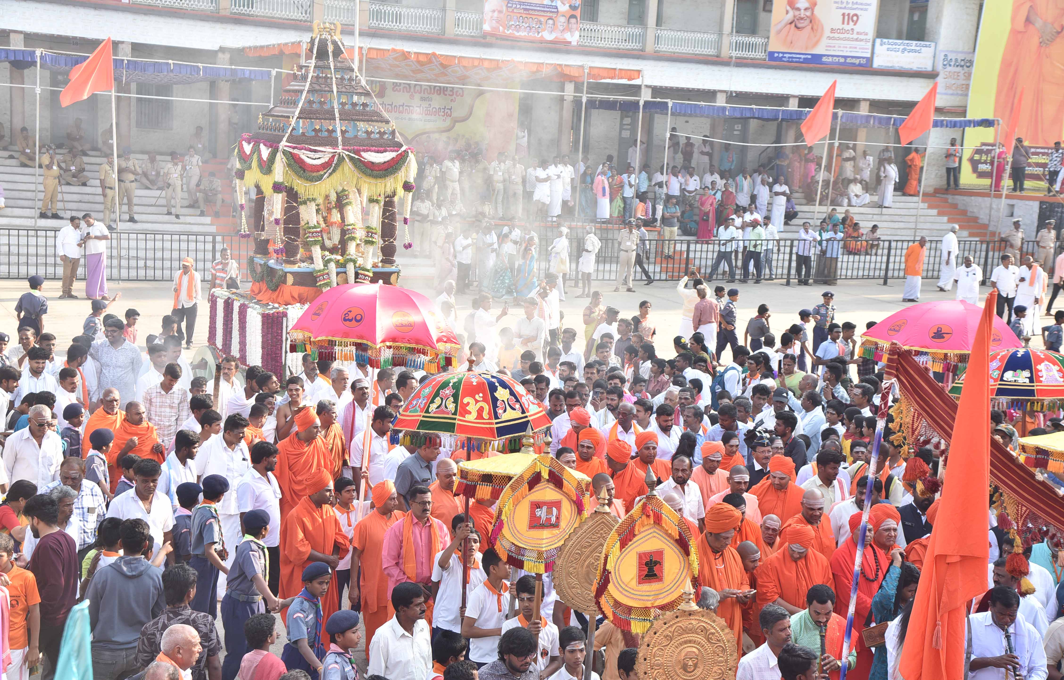 ಪುತ್ಥಳಿ ಮೆರವಣಿಗೆ:ಶ್ರೀ ಶಿವಕುಮಾರ ಸ್ವಾಮೀಜಿಯವರ 119ನೇ ಜಯಂತಿ ಪ್ರಯುಕ್ತ ಬೆಳಿಗ್ಗೆ 8 ಗಂಟೆಗೆ ಗದ್ದುಗೆ ಮಂದಿರದ ಮುಂಭಾಗದಿಂದ ಆರಂಭವಾದ ಶ್ರೀಗಳ ಕಂಚಿನ ಪುತ್ಥಳಿ ಹೊತ್ತ ರುದ್ರಾಕ್ಷಿ ಮಂಟಪದ ಮೆರವಣಿಗೆಗೆ ಮಠಾಧ್ಯಕ್ಷರಾದ ಸಿದ್ದಲಿಂಗ ಸ್ವಾಮೀಜಿ ಚಾಲನೆ ನೀಡಿದರು.ಮೆರವಣಿಗೆಯುದ್ಧಕ್ಕೂ ನಂದಿಧ್ವಜ ಕುಣಿತ, ಕರಡಿ ವಾದ್ಯ, ಡೋಲು ಕುಣಿತ ಸೇರಿದಂತೆ ವಿವಿಧ ಜಾನಪದ ಕಲಾ ತಂಡಗಳ ಪ್ರದರ್ಶನ ನೋಡುಗರ ಗಮನ ಸೆಳೆದವು.ಶ್ರೀಮಠದ ಆವರಣದಲ್ಲಿ ನಡೆದ ಮೆರವಣಿಗೆಯಲ್ಲಿ 119 ಪೂರ್ಣಕುಂಭ ಕಳಸ ಹೊತ್ತ ಸುಮಂಗಲಿಯರು, ಹರಗುರುಚರಮೂರ್ತಿಗಳು, ಕಿರಿಯ ಶ್ರೀ ಶಿವಸಿದ್ದೇಶ್ವರ ಸ್ವಾಮೀಜಿ, ಭಕ್ತಾದಿಗಳು, ಮಕ್ಕಳು ಹೆಜ್ಜೆ ಹಾಕಿದ್ದು ವಿಶೇಷವಾಗಿತ್ತು.ಶ್ರೀ ಕ್ಷೇತ್ರದಲ್ಲಿ ಎಂದಿನಂತೆ ಶ್ರೀಗಳ ಜಯಂತಿ ಹಾಗೂ ಗುರುವಂದನಾ ಮಹೋತ್ಸವಕ್ಕೆ ೬ ಕಡೆ ವಿಶೇಷ ದಾಸೋಹದ ವ್ಯವಸ್ಥೆ ಮಾಡಲಾಗಿತ್ತು. ಶ್ರೀ ಕ್ಷೇತ್ರಕ್ಕೆ ಆಗಮಿಸಿದ ಸಹಸ್ರಾರು ಭಕ್ತರಿಗೆ ಬೆಳಗಿನ ಉಪಹಾರ, ಮಧ್ಯಾಹ್ನ ಮತ್ತು ರಾತ್ರಿ ಊಟದ ವ್ಯವಸ್ಥೆಯನ್ನು ಮಾಡಲಾಗಿತ್ತು. ಕ್ಷೇತ್ರದ ೬ ಕಡೆ ಮಹಾಪ್ರಸಾದದ ವಿನಿಯೋಗ ನಡೆಯುತ್ತಿದ್ದು, ಮಧ್ಯಾಹ್ನ ಊಟಕ್ಕೆ ಸಿಹಿ ಬೂಂದಿ, ಖಾರ ಬೂಂದಿ, ಚಿತ್ರಾನ್ನ, ಪಲ್ಯ, ಕೋಸಂಬರಿ, ಅನ್ನ ಸಾಂಬರು, ಪಾಯಸ, ಮಜ್ಜಿಗೆ ಸೇರಿದಂತೆ ವಿವಿಧ ಬಗೆಯ ಖಾದ್ಯಗಳನ್ನು ತಯಾರಿಸಲಾಗಿತ್ತು.ಇನ್ನು ರಾತ್ರಿ ಊಟಕ್ಕೂ ಸಹ ವಿವಿಧ ಬಗೆಯ ಖಾದ್ಯಗಳನ್ನು ತಯಾರಿಸಲಾಗಿದ್ದು, 1 ಲಕ್ಷಕ್ಕೂ ಅಧಿಕ ಮಂದಿ ಭಕ್ತಾದಿಗಳಿಗೆ ದಾಸೋಹದ ವ್ಯವಸ್ಥೆ ಮಾಡಲಾಗಿತ್ತು. ನಾಡಿನಾದ್ಯಂತ ಆಗಮಿಸಿದ್ದ ಭಕ್ತಾದಿಗಳು ಶ್ರೀಕ್ಷೇತ್ರದ ಪ್ರಸಾದವನ್ನು ಸೇವಿಸಿ ಪುನೀತರಾದರು.
