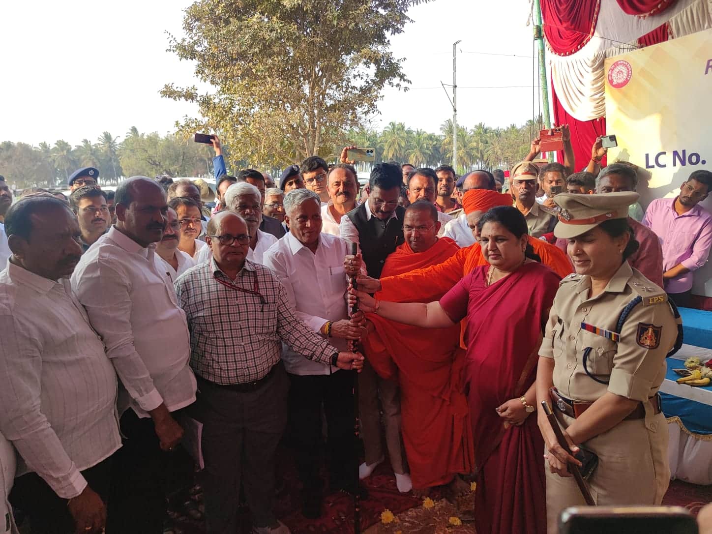 ಹಗರಿಬೊಮ್ಮನಹಳ್ಳಿಯಲ್ಲಿ ಭಾನುವಾರ ಲೆವೆಲ್ ಕ್ರಾಸಿಂಗ್ 35ರ ಮೇಲ್ಸೇತುವೆ ಕಾಮಗಾರಿಗೆ ಭೂಮಿಪೂಜೆ ಹಾಗೂ ಶಂಕುಸ್ಥಾಪನಾ ಕಾರ್ಯಕ್ರಮದಲ್ಲಿ ಕೇಂದ್ರ ಜಲಶಕ್ತಿ ಹಾಗೂ ರೈಲ್ವೆ ರಾಜ್ಯ ಖಾತೆ ಸಚಿವ ವಿ. ಸೋಮಣ್ಣ ಭಾಗವಹಿಸಿದ್ದರು.