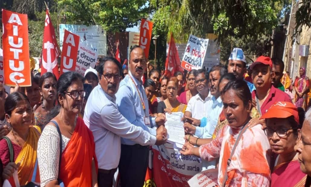 ಕೇಂದ್ರ ಜಾರಿಗೆ ತಂದಿರುವ 4 ಕರಾಳ ಕಾರ್ಮಿಕ ಸಂಹಿತೆ (ಲೇಬರ್ ಕೋಡ್) ಹಿಂಪಡೆಯುವಂತೆ ಆಗ್ರಹಿಸಿ ನಗರದಲ್ಲಿ ಬೃಹತ್ ಪ್ರತಿಭಟನಾ ಮೆರವಣಿಗೆ ನೆಡಸಿ ಜಿಲ್ಲಾಧಿಕಾರಿಗಳ ಮೂಲಕ ಕೇಂದ್ರ ಸರ್ಕಾರಕ್ಕೆ ಮನವಿ ಸಲ್ಲಿಸಲಾಯಿತು.ಸಿ.ಐ.ಟಿ.ಯು ಮತ್ತು ಜೆ.ಸಿ.ಟಿ.ಯು ಜಿಲ್ಲಾ ಸಂಚಾಲಕ ಲಕ್ಷ್ಮಣ ಹಂದ್ರಾಳ ಮಾತನಾಡಿ, ಕೇಂದ್ರ ಸರ್ಕಾರದ ಕಡು ದುಡಿಯುವ ವರ್ಗದ ವಿರೋಧಿ 4 ಕರಾಳ ಕಾರ್ಮಿಕ ಸಂಹಿತೆ (ಲೇಬರ್ ಕೋಡ್) ಗಳ ವಿರುದ್ಧ ಮತ್ತು ದುಡಿಯುವ ಜನರು ಸೇರಿದಂತೆ ಎಲ್ಲಾ ಜನರ ಹಕ್ಕುಗಳು ಮತ್ತು ಬದುಕಿನ ಮೇಲೆ ನಡೆಸುತ್ತಿರುವ ದೌರ್ಜನ್ಯವಾಗಿದೆ. ಇದು ಅತ್ಯಂತ ನಿರ್ದಯವಾದ ಸರ್ವಾಂಗೀಣ ದಾಳಿಯ ಮಾಡುತ್ತಿರುವ ಸರ್ಕಾರಗಳ ವಿರುದ್ಧ ಪ್ರಬಲವಾದಂತಹ ಹೋರಾಟ ಕಟ್ಟುವ ಅವಶ್ಯಕತೆ ಇದೆ ಎಂದರು.