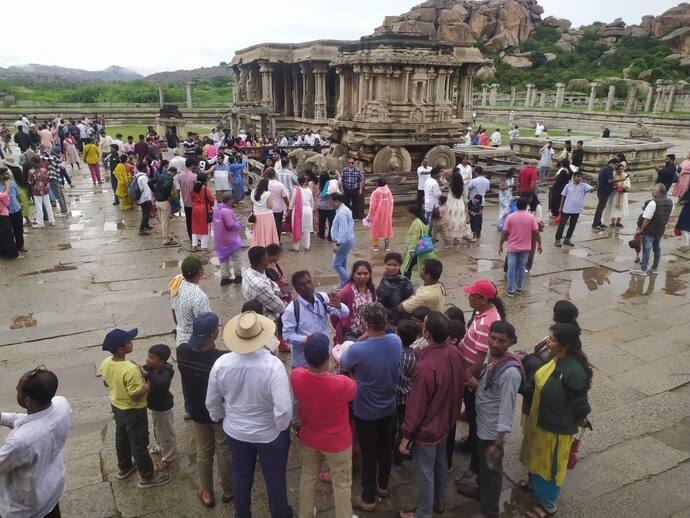 ದೀಪಾವಳಿ ಹಿನ್ನೆಲೆಯಲ್ಲಿ ಹಂಪಿಗೆ ಭಾರೀ ಪ್ರಮಾಣದಲ್ಲಿ ಪ್ರವಾಸಿಗರು ಆಗಮಿಸಿ ಸ್ಮಾರಕಗಳ ಮಾಹಿತಿ ಪಡೆದಿದ್ದಾರೆ. ಹಂಪಿ, ಹೊಸಪೇಟೆ, ಗಂಗಾವತಿ, ಕಮಲಾಪುರ, ಆನೆಗೊಂದಿ ಭಾಗದ ಹೊಟೇಲ್, ರೆಸಾರ್ಟ್, ಹೋಂ ಸ್ಟೇಗಳು ರಶ್ ಆಗಿದ್ದು, ಪ್ರವಾಸೋದ್ಯಮ ನೆಚ್ಚಿಕೊಂಡವರ ಬದುಕಿನ ಬಂಡಿಗೂ ಆಸರೆ ಆಗಿದ್ದಾರೆ.ಹಂಪಿಯಲ್ಲಿ ಭಾರೀ ಪ್ರಮಾಣದಲ್ಲಿ ಪ್ರವಾಸಿಗರು ಆಗಮಿಸಿದ್ದರಿಂದ ಕೆಲ ರೆಸ್ಟೋರೆಂಟ್ ಗಳಲ್ಲಿ ಸರತಿ ಸಾಲಿನಲ್ಲಿ ನಿಂತು ಪ್ರವಾಸಿಗರು ಊಟ ಸವಿದಿದ್ದಾರೆ. ಒಮ್ಮೆಲೆ ಭಾರೀ ಪ್ರಮಾಣದಲ್ಲಿ ಪ್ರವಾಸಿಗರು ಆಗಮಿಸಿದ್ದರಿಂದ; ಈ ಬಾರಿ ಆತಿಥ್ಯ ನೀಡಲು ಸ್ವಲ್ಪ ಗೊಂದಲ ಆಯಿತು. ಆದರೂ ಪ್ರವಾಸಿಗರು ತಾಳ್ಮೆಯಿಂದ ಸರದಿ ಸಾಲಿನಲ್ಲಿ ನಿಂತು ಊಟ ಸವಿದಿದ್ದಾರೆ ಎಂದು ರೆಸ್ಟೋರೆಂಟ್ ವೊಂದರ ಮಾಲೀಕ ಭೀಮು ಕನ್ನಡಪ್ರಭಕ್ಕೆ ತಿಳಿಸಿದರು.