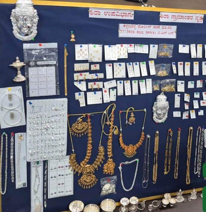 ಶಿರಾ: ಹಾಡು ಹಗಲೇ ಚಿನ್ನದಂಗಡಿಗೆ ನುಗ್ಗಿ 30 ಲಕ್ಷ ಕ್ಕೂ ಅಧಿಕ ಮೌಲ್ಯದ ಚಿನ್ನ ಹಾಗೂ ಬೆಳ್ಳಿ ಆಭರಣ ಕದ್ದಿದ್ದ ಕಳ್ಳರನ್ನು ಘಟನೆ ನಡೆದ 24 ಗಂಟೆಯೊಳಗೆ ಬಂಧಿಸುವಲ್ಲಿ ಪೊಲೀಸರು ಯಶಸ್ವಿಯಾಗಿದ್ದಾರೆ.