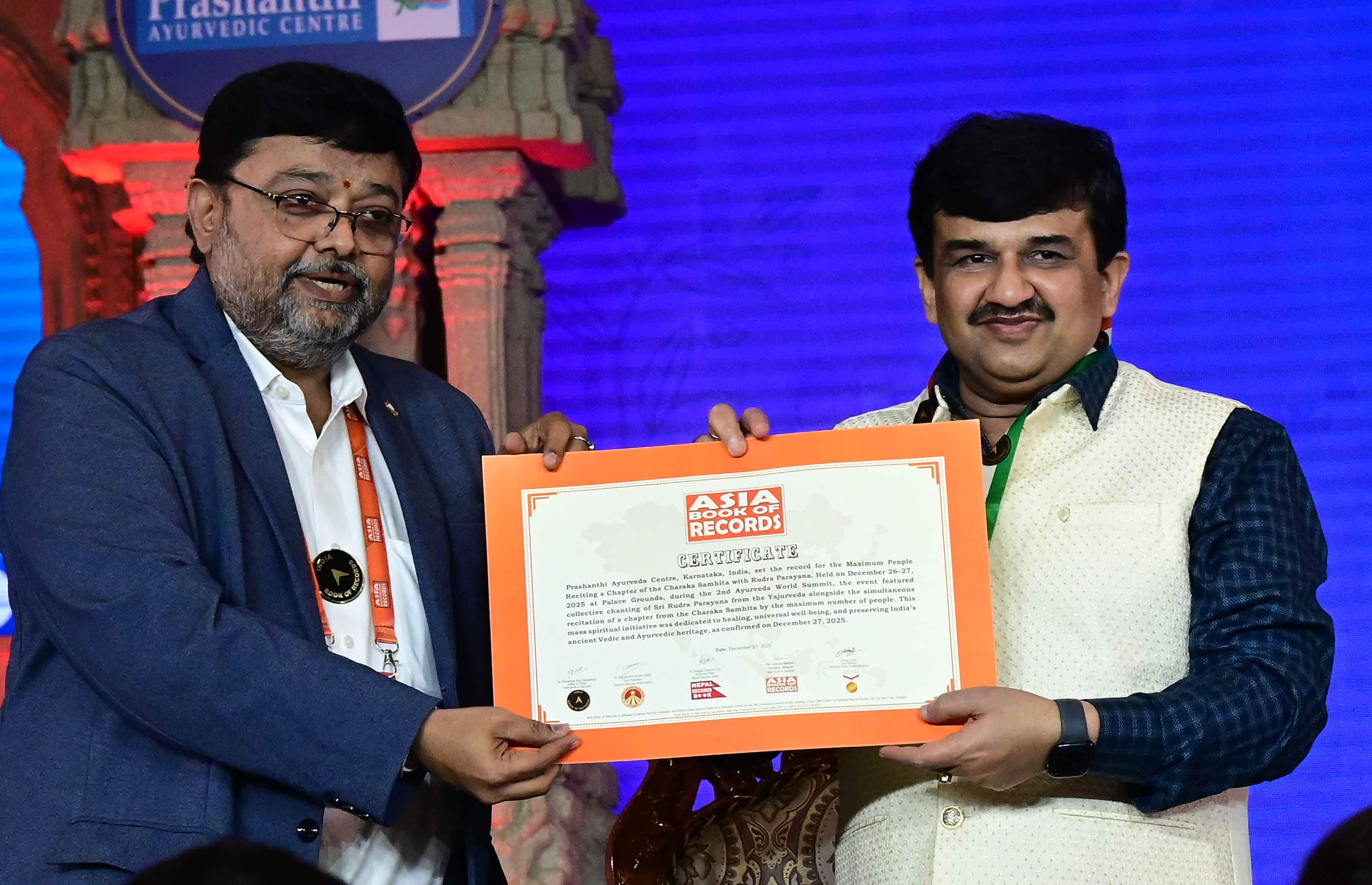 ಆಯುರ್ವೇದದಲ್ಲಿ ಮಹತ್ತರ ಸ್ಥಾನ ಪಡೆದ ‘ಅಷ್ಟಾಂಗ ಹೃದಯ ಸಂಹಿತೆ ದಿನಚರ್ಯ ಅಧ್ಯಾಯ’ವನ್ನು 4 ಸಾವಿರಕ್ಕೂ ಅಧಿಕ ಜನರು ಏಕಕಾಲಕ್ಕೆ ಪಠಿಸುವ ಮೂಲಕ ಇಂಡಿಯನ್ ಬುಕ್ಸ್ ಆಫ್ ರೆಕಾರ್ಡ್ಸ್ ಹಾಗೂ ಏಷಿಯಾ ಬುಕ್ಸ್ ಆಫ್ ರೆಕಾರ್ಡ್ನಲ್ಲಿ ದಾಖಲೆ ಬರೆದರು.