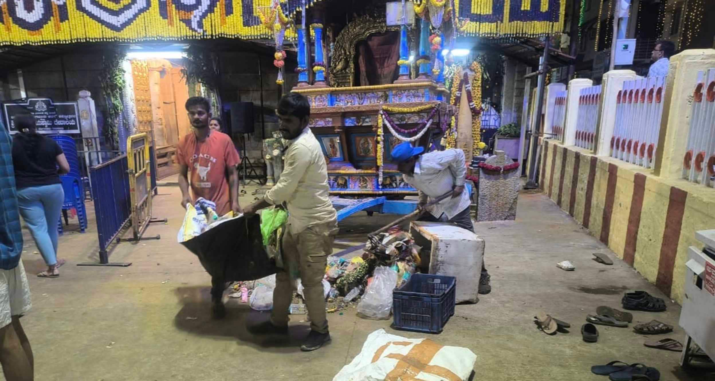 ಧರ್ಮರಾಯಸ್ವಾಮಿ ದೇವಸ್ಥಾನ ಆವರಣದಲ್ಲಿ ಸಿಬ್ಬಂದಿಯಿಂದ ಸ್ವಚ್ಛತಾ ಕಾರ್ಯ.