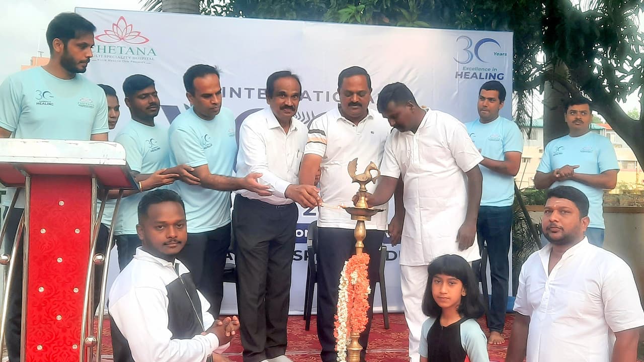 ವಿಶ್ವ ಯೋಗದಿನದ ಅಂಗವಾಗಿ ಪಟ್ಟಣದ ಚೇತನ ಆಸ್ಪತ್ರೆ ಆವರಣದಲ್ಲಿ ಕಾರ್ಯಕ್ರಮ