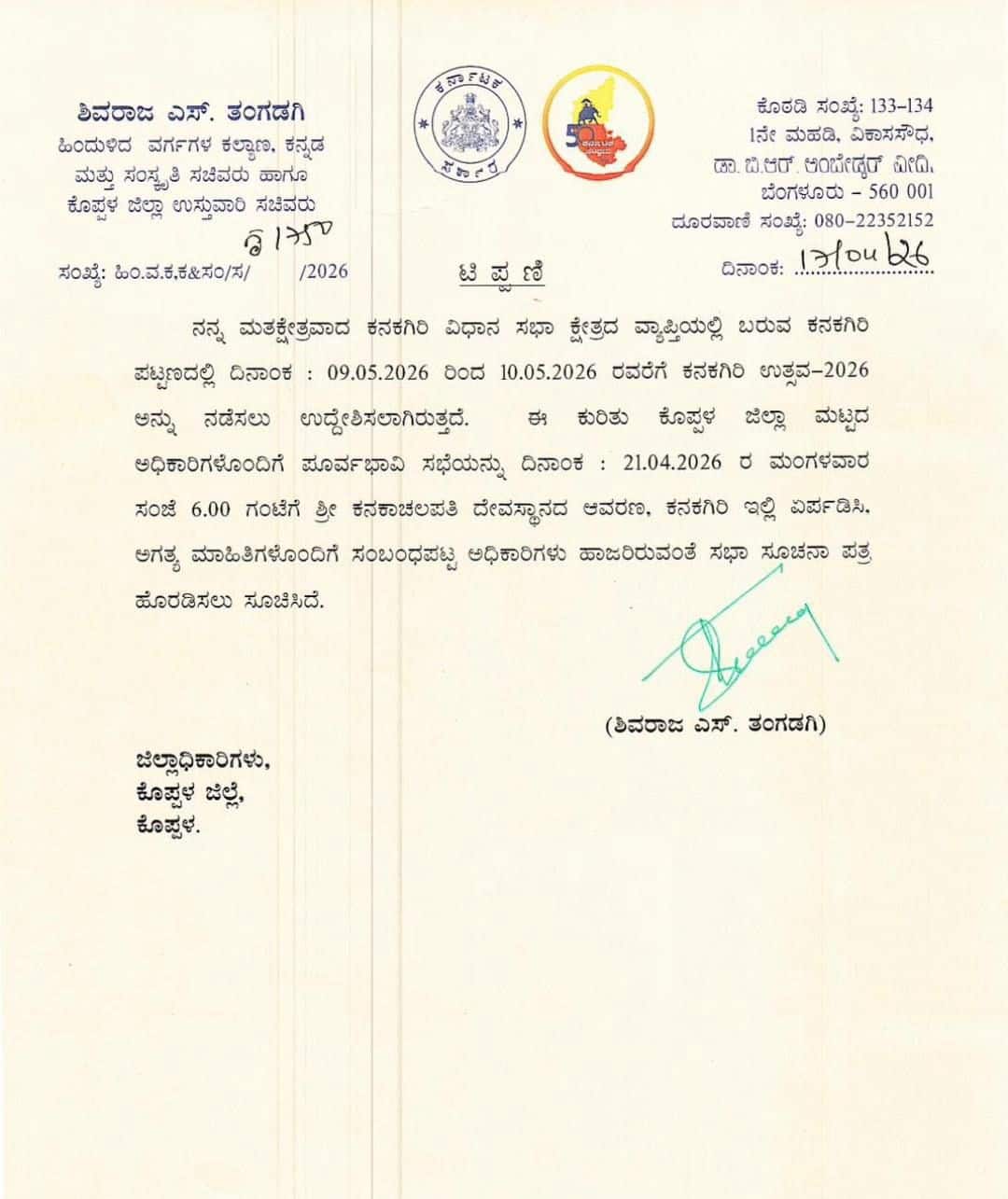 ರಾಜ್ಯದ ಹಲವು ಉತ್ಸವಗಳ ಆಚರಣೆಯ ಬಳಿಕ ಕನ್ನಡ ಮತ್ತು ಸಂಸ್ಕೃತಿ ಇಲಾಖೆ ಸಚಿವ ಶಿವರಾಜ ತಂಗಡಗಿ ತಮ್ಮದೇ ತವರು ಕ್ಷೇತ್ರದ ಕನಕಗಿರಿ ಉತ್ಸವ ಆಚರಣೆಗೆ ಮುಂದಾಗಿದ್ದು, ಬಿಸಿಲಿನ ಬೇಗೆಯ ನಡುವೆಯೂ ಕನಕಗಿರಿ ಜನತೆಯಲ್ಲಿ ಉತ್ಸವದ ಸಂಭ್ರಮ ಶುರುವಾಗಿದೆ.ಹೌದು, 2025ರಲ್ಲಿ ಕನಕಾಚಲಪತಿ ಜಾತ್ರೆಯೊಂದಿಗೆ ಕನಕಗಿರಿ ಉತ್ಸವ ಆಚರಿಸಲು ಮುಂದಾಗಿದ್ದಕ್ಕೆ ಸ್ಥಳೀಯರಿಂದ ವಿರೋಧ ವ್ಯಕ್ತವಾದ ಹಿನ್ನೆಲೆಯಲ್ಲಿ ಉತ್ಸವ ಆಚರಣೆ ಕೈಬಿಡಲಾಗಿತ್ತು. 2026ರ ಸಾಲಿನಲ್ಲಾದರೂ ಉತ್ಸವ ಆಚರಿಸಬೇಕೆನ್ನುವ ಕೂಗು ಸ್ಥಳೀಯ ಕನ್ನಡಪರ ಸಂಘಟನೆ ಹಾಗೂ ಸಾರ್ವಜನಿಕರಿಂದ ಬಂದಿದ್ದರಿಂದ ಕನಕಗಿರಿ ಉತ್ಸವ ಆಚರಿಸಲು ಸಚಿವರು ಆಸಕ್ತಿ ತೋರಿದ್ದು, ಉತ್ಸವ ಆಚರಣೆಯ ಕುರಿತು ಏ. ೨೧ರಂದು ಕನಕಾಚಲಪತಿ ದೇವಸ್ಥಾನದಲ್ಲಿ ಪೂರ್ವಭಾವಿ ಸಭೆ ಆಯೋಜಿಸಲಾಗಿದೆ.