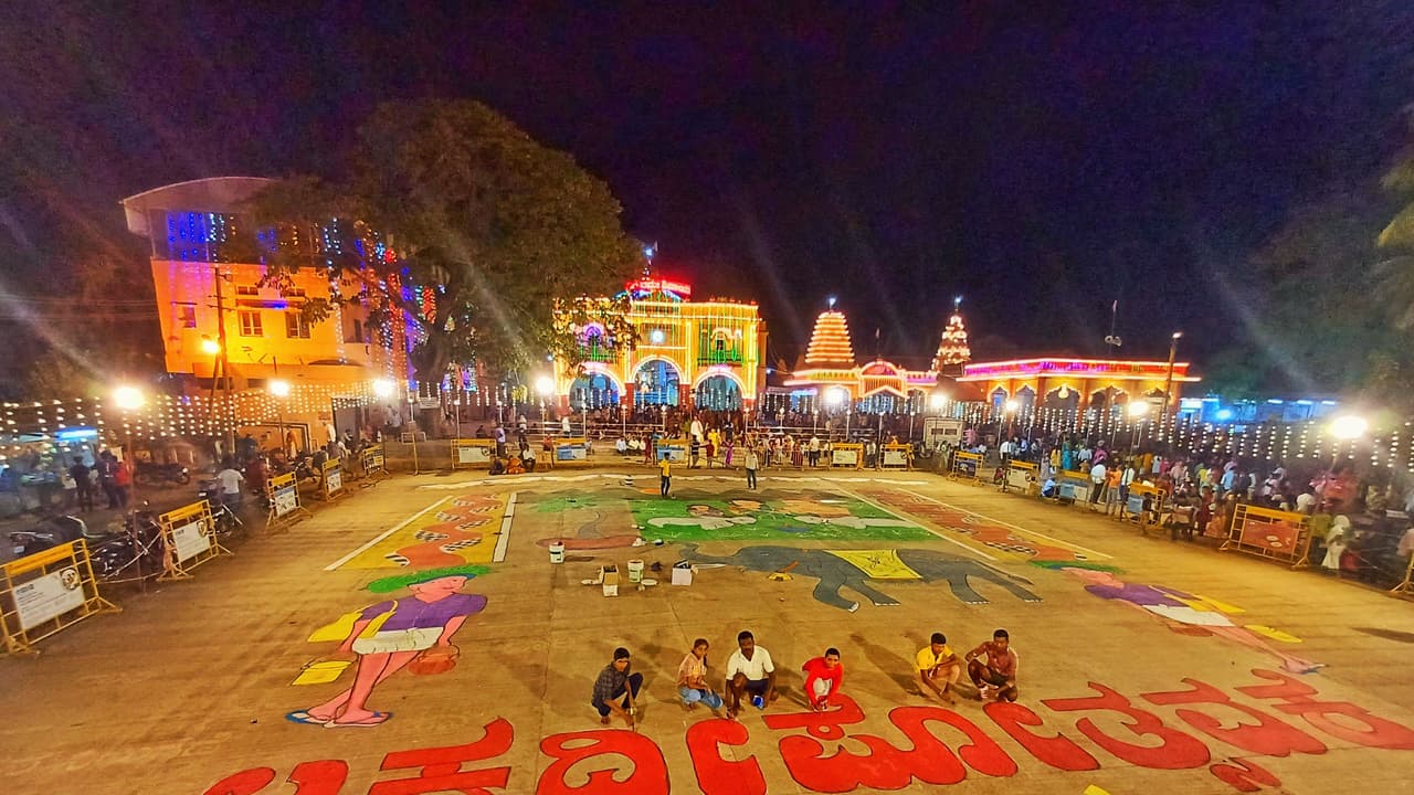 ಇಲ್ಲಿನ ಶ್ರೀ ಸಿದ್ಧಾರೂಢರ ಮಠದಲ್ಲಿ ಮಂಗಳವಾರ ಲಕ್ಷ ದೀಪೋತ್ಸವದ ಹಿನ್ನೆಲೆಯಲ್ಲಿ ಚನ್ನಬಸಪ್ಪ ನೆಗಳೂರ ಕುಟುಂಬ ನಾಡಿನ ಕಲೆ, ಸಂಸ್ಕೃತಿ ಸಾರುವ ಚಿತ್ರ ಬಿಡಿಸುವ ಮೂಲಕ ಜನರಲ್ಲಿ ಸಂಸ್ಕೃತಿಯ ಮೆರುಗು ತೋರಿಸುವ ಕಾರ್ಯ ಕೈಗೊಂಡಿದ್ದಾರೆ.