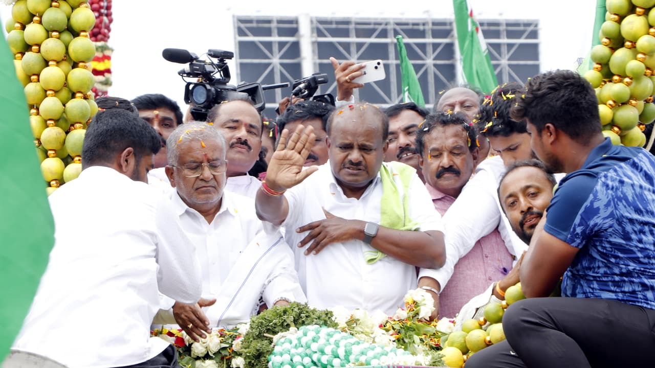 ಪ್ರಧಾನಿ ನರೇಂದ್ರ ಮೋದಿ ಸಚಿವ ಸಂಪುಟದಲ್ಲಿ ಉಕ್ಕು ಮತ್ತು ಬೃಹತ್ ಕೈಗಾರಿಕೆ ಸಚಿವರಾದ ಬಳಿಕ ಮೊದಲ ಬಾರಿಗೆ ರಾಜ್ಯಕ್ಕೆ ಆಗಮಿಸಿದ ಎಚ್.ಡಿ.ಕುಮಾರಸ್ವಾಮಿ ಅವರನ್ನು ಜೆಡಿಎಸ್ ನಾಯಕರು, ಮುಖಂಡರು ಹಾಗೂ ಕಾರ್ಯಕರ್ತರು ಅದ್ಧೂರಿ ಸ್ವಾಗತ ಕೋರಿದರು.