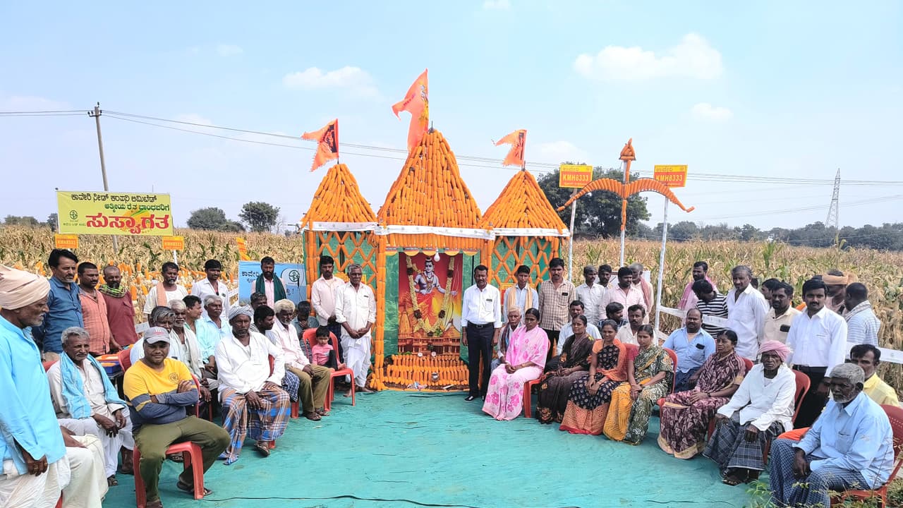 ಜ. 22ರಂದು ಜರುಗುವ ಶ್ರೀರಾಮಮಂದಿರ ಹಿನ್ನೆಲೆಯಲ್ಲಿ ನಾವು ಕೂಡಾ ರೈತರ ಬೆಳೆಯಿಂದ ರಾಮಮಂದಿರವನ್ನು 4 ಸಾವಿರ ಜೋಳದ ತೆನೆಯಿಂದ ಮಾಡಿದ್ದೇವೆ ಎಂದರು.ರಾಜ್ಯಾದ್ಯಂತ ಕಾವೇರಿ ಸೀಡ್ಸ್ ಕಂಪನಿಯಿಂದ ಗೋವಿನ ಜೋಳದ ಬೀಜವನ್ನು ಮುಂಗಾರು ಮತ್ತು ಹಿಂಗಾರಿ ಸಾವಿರ ಟನ್ ಬೀಜವನ್ನು ರೈತರು ಖರೀದಿಸಿ ಬಿತ್ತುವುದರ ಮೂಲಕ ಉತ್ತಮ ಇಳುವರಿಯನ್ನು ಪಡೆದು ಆರ್ಥಿಕವಾಗಿ ರೈತರು ಮುಖ್ಯ ವಾಹಿನಿಗೆ ಬರಲು ಕಾರಣವಾಗಿದೆ. ಆ ಹಿನ್ನೆಲೆಯಲ್ಲಿ ಇನ್ನು ಹೆಚ್ಚು ರೈತರು ಗೋವಿನ ಜೋಳದ ಬೀಜದ ಸದುಪಯೋಗವನ್ನು ಪಡೆದುಕೊಳ್ಳಲು ಮುಂದಾಗಬೇಕೆಂದು ಹೇಳಿದರು.ರೈತ ಶ್ರೀಗುರಪ್ಪ ಚಿಕರೆಡ್ಡಿ ಮಾತನಾಡಿ, ಕಾವೇರಿ ಗೋವಿನ ಜೋಳದ ಬೀಜವನ್ನು 3 ವರ್ಷದಿಂದ ಬಿತ್ತನೆ ಮಾಡಿ ಉತ್ತಮ ಇಳುವರಿಯನ್ನು ಪಡೆದು ಉತ್ತಮ ಲಾಭವನ್ನು ಹೊಂದಲು ನಮಗೆ ಸಹಕಾರಿಯಾಗಿದೆ. ಇವತ್ತು ರಾಮ ಮಂದಿರ ನಿರ್ಮಿಸಿರುವುದು ಸಂತೋಷ ತಂದಿದೆ ಎಂದು ಹೇಳಿದರು.