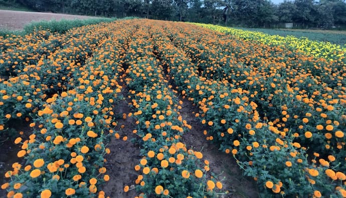 ಭರ್ಜರಿ ಹೂವು ಬೆಳೆದ ರೈತರು:ಹುಬ್ಬಳ್ಳಿ ತಾಲೂಕಿನ ಚವರಗುಡ್ಡ, ರಾಮಾಪೂರ, ಚಳಮಟ್ಟಿ, ಮಿಶ್ರಿಕೋಟಿ, ಕಾಡನಕೊಪ್ಪ, ಕೂರವಿನಕೊಪ್ಪ, ಹೀರೆಹೊನ್ನಳ್ಳಿ ಭಾಗಗಳಲ್ಲಿ 50ಕ್ಕೂ ಹೆಚ್ಚು ರೈತರು ನೂರಾರು ಎಕರೆಯಲ್ಲಿ ಬಗೆ-ಬಗೆಯ ಹೂವಿನ ಬೆಳೆ ಬೆಳೆದಿದ್ದಾರೆ. ಅದರಲ್ಲಿ ಚೆಂಡು ಹೂವು ಪ್ರದೇಶವೇ ಹೆಚ್ಚಿದೆ. ತೋಟಗಳಲ್ಲಿ ಆಕಾಶದಲ್ಲಿ ನಕ್ಷತ್ರಗಳು ಹೊಳೆಯುವಂತೆ ತರಹೇವಾರಿ ಹೂವುಗಳು ಕಣ್ಣಿಗೆ ರಾಚುತ್ತವೆ. ಬಣ್ಣ ಬಣ್ಣದ ಸೇವಂತಿಗೆ, ಚೆಂಡು ಹೂ, ಮಲ್ಲಿಗೆ, ಚಿಂತಾವಣಿ, ಗುಲಾಬಿ ಹೂವುಗಳು ಕಾಣಿಸುತ್ತಿವೆ.